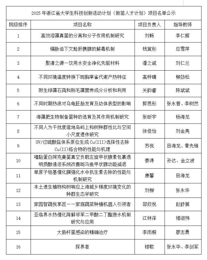 根据《关于开展浙江省老员工科技创新活动计划(新苗人才计划)2025年度项目申报的通知》,经过团队申报、公司审核、专家评审,2025年新苗人才计划的评审结果排序如下(公司有三个自主立项名额)。公司推荐《高效溶藻真菌的分离和分子作用机制研究》、《镉胁迫下文蛤肝胰腺的解毒机制》、《聚清之源—饮用水安全净化先驱材料》。其余项目推荐公司参加评审,公示时间从即日起至1月21日,如有异议,请与杨雨田老师联系,联系电话:0577-86598963。