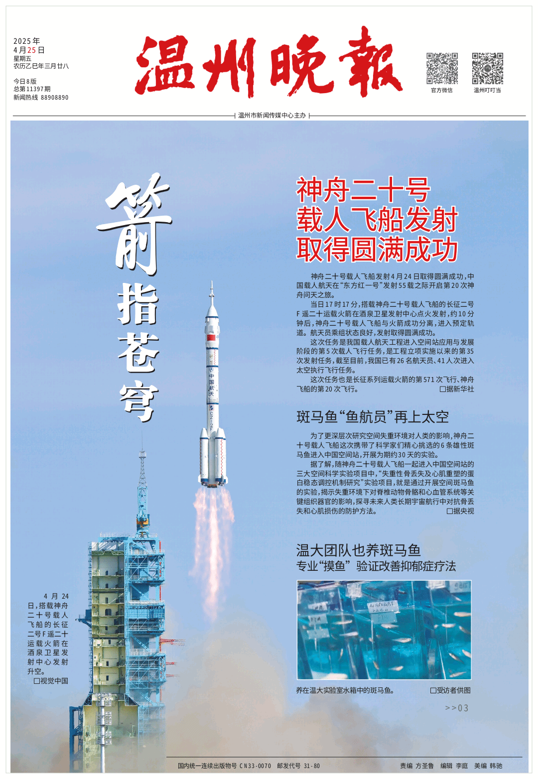 4月24日17时17分,神舟二十号载人飞船在第十个“中国航天日”领命出征,载着斑马鱼、涡虫和链霉菌驶向太空。