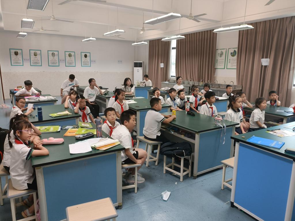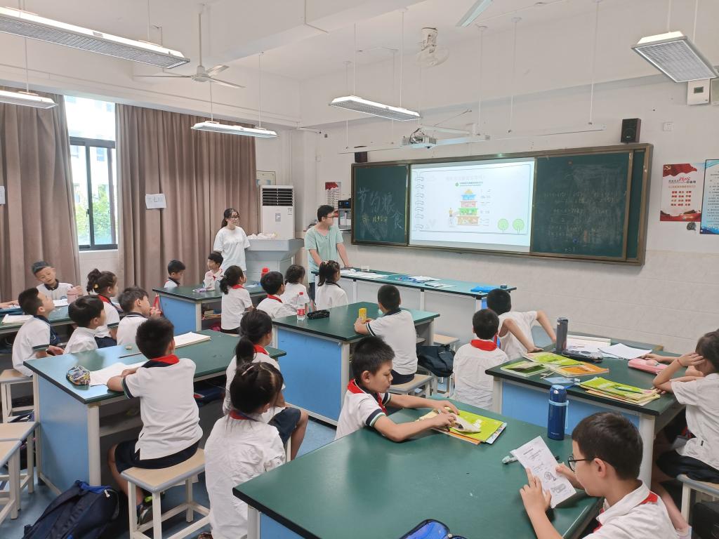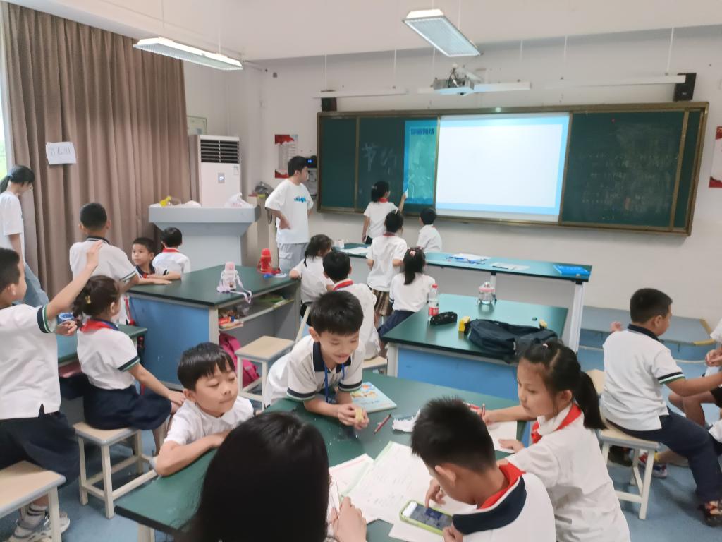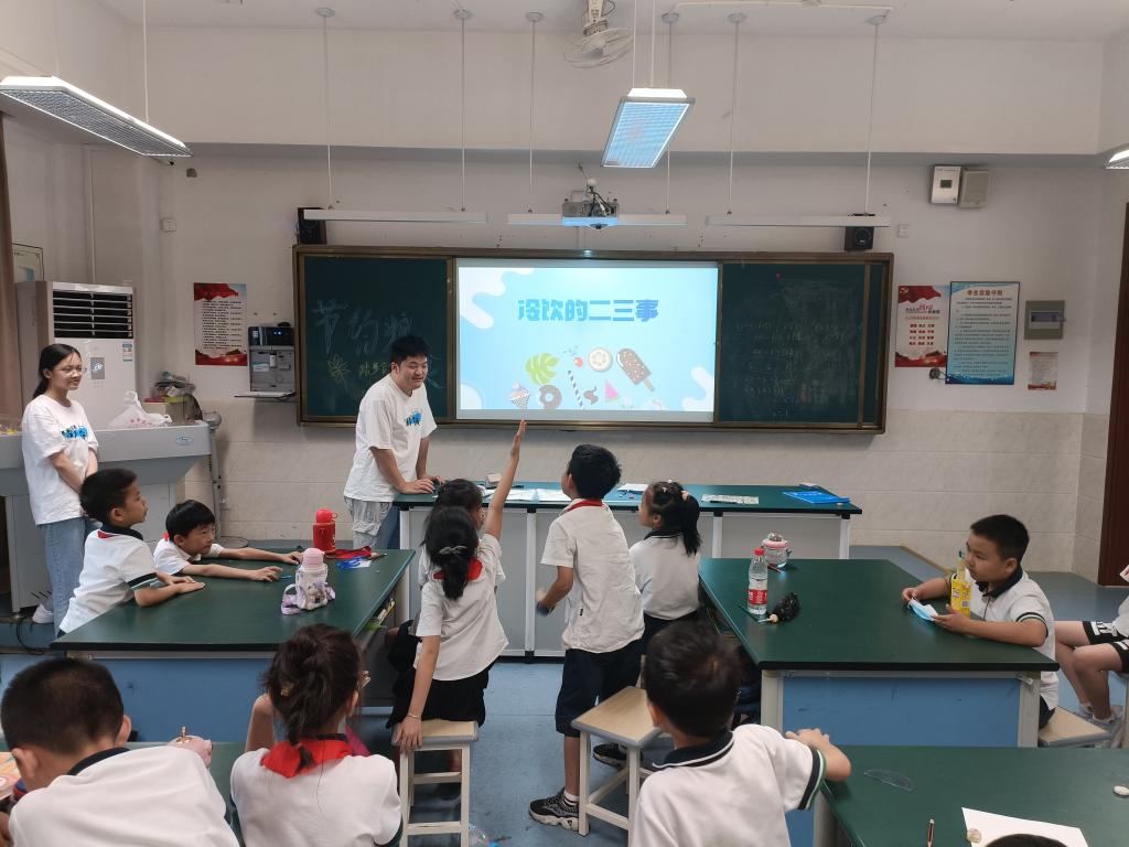 首先,黄城源同学以“膳食平衡”为主题给小朋友们带来今天的第一堂课。课堂开始,黄城源同学用一张膳食金字塔引出本讲的核心,再从其最底层开始依次向上,详细讲解金字塔每层的内容,并介绍食物中所含的营养物质。其中,黄城源同学尤其详细地讲解了蔬菜和水果之间的区别和膳食均衡的重要性。第二堂课,夏远强同学首先提出“冷饮有什么危害”这个问题,引起了小朋友的思考;再通过一段视频帮助小朋友们了解冷饮及冷饮的由来。夏远强同学还告诉小朋友们雪糕并不能以在火烤下是否融化判断好坏,并告诫小朋友尽量少在流动摊点购买雪糕。此外,夏远强同学还教授小朋友们在购买雪糕的过程中该如何看配料表。课程还设置了你画我猜的游戏,以此的方式加深了小朋友们对夏季食品的印象。队员还给小朋友们准备了礼物,极大地调动了小朋友参与的积极性,进而将课堂氛围推向高潮。最后,夏老师以一段介绍中国传统夏季饮品的视频做为结尾。在结束了两节宣讲课后,小朋友们迎来了30分钟的活动时间,队员们带领小朋友们进行“一二三木头人”等游戏。在活动结束后 ,实践队员指导小朋友们完成他们的功课,为他们解答疑惑。此次宣讲在欢乐的氛围中结束。