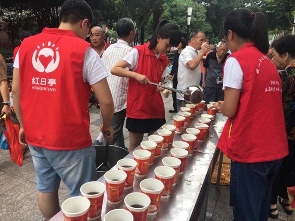 一棵大榕树,一座红日亭。情暖温州小分队迈入温州民间长久以来的道德慈善地标。身穿红色小马甲,送伏茶小分队推着小车,踩着光点,在红日亭、雷锋亭、步行街、公交车站、菜场等地散落着实践队员们热情地送伏茶的足迹。满怀着可以送出每杯伏茶的豪情,亦不输敢于面对不同言论的心。尽管害怕被拒绝,但仍微微一笑,脱口而出的一句“喝点伏茶吧!”,真诚地用双手奉上满载爱心的解暑伏茶。
