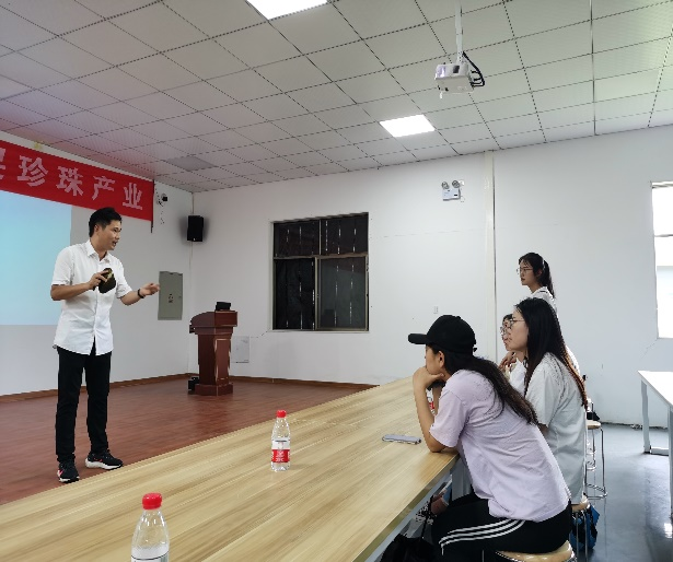 接着,同学们参观了500亩的自动化清水珍珠养殖示范基地,了解到在亩产超传统6倍的养殖密度下,养殖区的水质仍然可以维持III-IV类水质。同学们和企业人员展开了深入的交流。郭伟锋董事长通过现场解剖珍珠蚌,为大家详细讲解了珍珠蚌各个器官的作用,以及捕食藻类、净化水质的过程。在讨论的过程中,大家还了解了珍珠蚌捕食藻类的原理、珍珠蚌生长年龄的判别以及形成不同颜色珍珠的原因等。