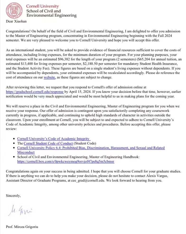 近日,2024届环境工程专业毕业生周校含斩获西北大学(NU)、杜克大学(DU)、加利福尼亚大学(UCLA)、约翰斯·霍普金斯大学(JHU)、华盛顿大学(UW)、圣路易斯华盛顿大学(WU)、康奈尔大学(Cornell)、卡内基梅隆大学(CMU)等8所世界名校的11封录取通知书。这些公司的世界排名都在第10-60位之间,属于世界顶尖名校。经过深思熟虑后,周校含最终选择了康奈尔大学(Cornell University)。