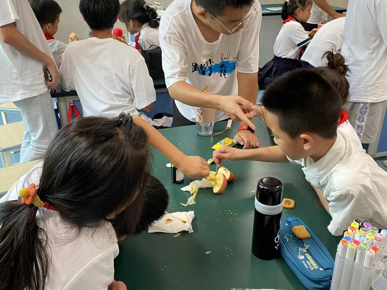 活动分为知识宣讲、集体游戏、作业辅导三个部分。第一堂课由杜玉龙同学为小朋友们介绍病从口入的现象,提醒同学们注意个人卫生,告诫小朋友们在选择正确食品种类的同时注重自己的饮食习惯。课堂上,队员们以视频和提问相结合的方式,让小朋友们知道好的饮食习惯更有助于我们的身体健康。第二堂课以“苹果柠檬”实验引入,后勤组和助教老师与各组小朋友们一起,给切开的苹果的表面涂柠檬汁,观察苹果表面的变化现象。紧接着陈心玥同学组织同学们开展“淀粉遇碘变蓝色”的实验,并指挥后勤组的同学给各个小组分配好棉签、苹果、柠檬、面包、饼干以及碘液。小朋友们在实践队队员的指导下都十分开心地拿起棉签往各个材料上涂碘液。苹果、面包、饼干遇碘后呈现出蓝色和紫红色都让小朋友们感到惊奇。通过这个实验,小朋友们了解到生活中常见的含淀粉食物有哪些,并帮助他们更好地记忆淀粉遇碘变蓝色或者紫红色这一小知识。