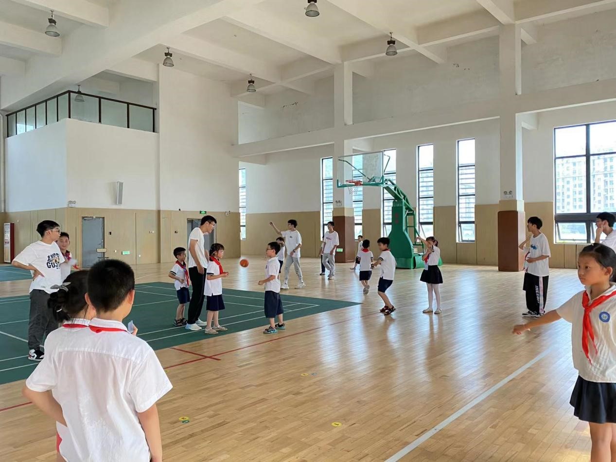 课程结束后,我队队员带领小朋友们去体育馆玩耍。小朋友们都沉浸在游戏中,玩得不亦乐乎。几轮游戏过后便到了学习时间,小朋友们都拿出作业认真完成,我队队员也都耐心地为小朋友们解答他们的问题。临近放学,我队队员都表现出对小朋友们的不舍,纷纷与他们合影留念。