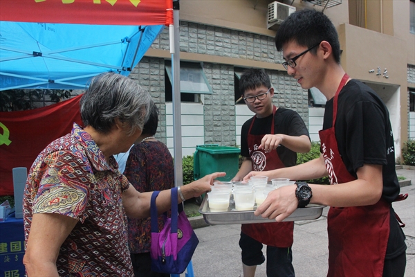 早上6点半,蒲公英实践小分队就随三乐亭的叔叔阿姨将热气腾腾的温州特色早饭糯米饭以及现磨的豆浆运往鹿城区蒲源社区。义工们在社区门口搭建好场地,紧接着阿姨们一边盛出热腾腾的糯米饭,撒上准备好的葱和碎油条,淋上一勺鲜美的肉末汤,另一边打上一杯杯现磨豆浆。一切准备就绪后,再由队员们将盛好的早饭送给为居民们服务的众多志愿者们。同是为人民服务,方式方法却不尽相同。有为居民义诊的医生;有免费配钥匙修鞋跟的师傅;还有手艺熟练免费理发的义工理发师。修理电器的师傅们更是受居民们的欢迎,熟练地修理着大大小小的电器。三乐亭的义工们为他们送上爱心早饭,一份早饭不仅点头微笑中表达对对方的尊重和感谢,更拉近了心与心之间的距离。