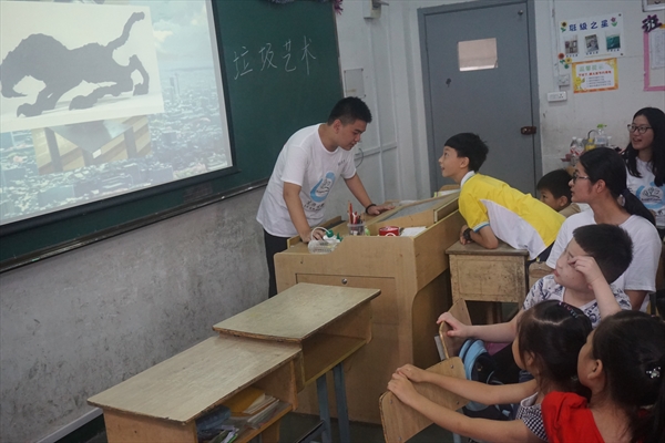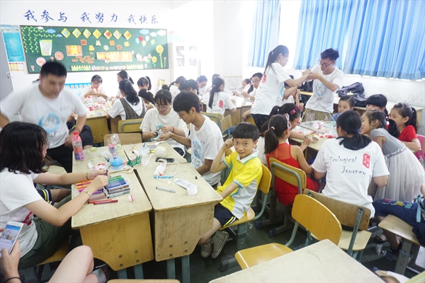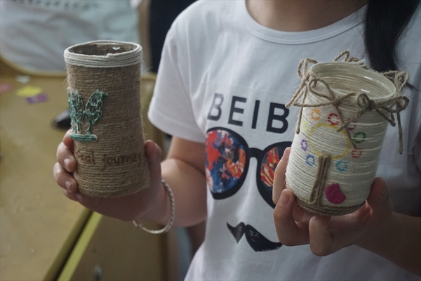 七月九日,“滴水·成韵”环保夏令营进行第四天。为了让小朋友们更好地了解环境污染现状,培养良好的环境保护意识,“生态之旅”实践队为小朋友们准备了“垃圾艺术”创意讲座和垃圾改造活动,鼓励小朋友们亲自动手将废弃的矿泉水瓶、纸、线等改造成艺术品。