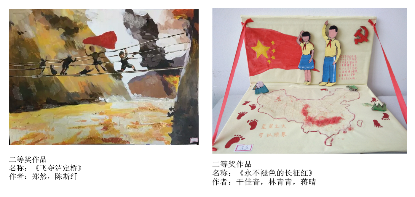 本次活动中,同学们展现了天马行空的想象。辽阔草地,如海苍山,逶迤五岭,苍茫雪原,红军战士们曾经历的道路在同学们的笔下诉说着当年的艰苦,在鲜艳的水彩上描绘着曾经的热血。返璞归真的叶脉有时是和平鸽丰满的羽翼,有时是红日初生时耀眼的光芒,为作品增添了淳真的元素,催生了新颖的想法。此生留得豪情在,再作长征岂畏难?从此山高不阻我志,涧深不断我行。