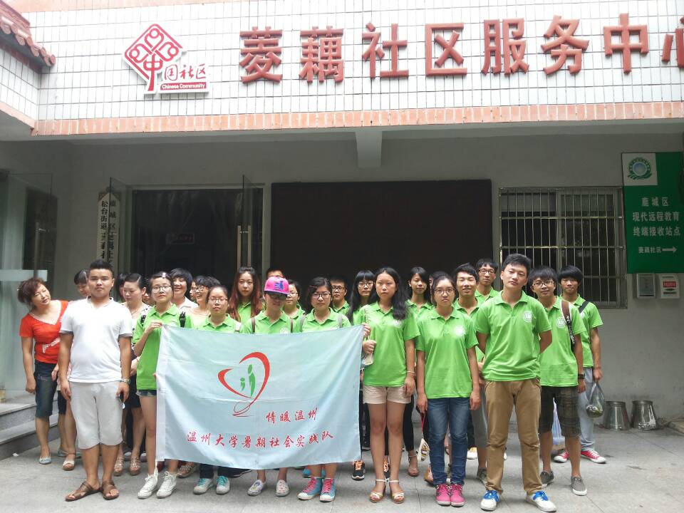 2014年7月3日至7月19日,在鹿城区菱藕、陡门等社区我们通过精彩纷呈的活动,在炎炎夏日下为社区的孩子们带去欢乐与回忆,给他们的记忆中留下一个独特的片段。队员们通过别开生面的游戏,内容丰富的动手活动为孩子 送去快乐,让他们重新找回童年应该有的快乐。在他们的欢声笑语中,队员们也感受到了志愿者活动的意义和内涵。
