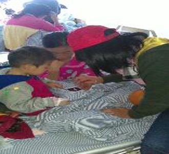 1点左右,志愿者们在温大南校门集合,等人到齐后,大家一起出发乘车前往附二医。经过一个小时左右的车程,我们在2点到达了附二医,并来到了8楼的心血管区。我们在8楼询问了值班的护士,知道了哪些小朋友是可以陪护的,然后我们将志愿者一一分配给小朋友。由于当时很多小朋友在睡午觉,所以8楼可以陪护的小朋友很少。于是,我们在经过8楼医生的允许下带着志愿者们来到了10楼的血液科。但由于这一楼的小朋友大多是最近刚做完化疗的,或者是白细胞偏低不宜陪护的,所以我们无奈只好回到8楼继续寻找。虽然这次活动中出现了些状况,但志愿者们的积极性依然很高,热情的陪小朋友们玩。此次活动圆满结束。