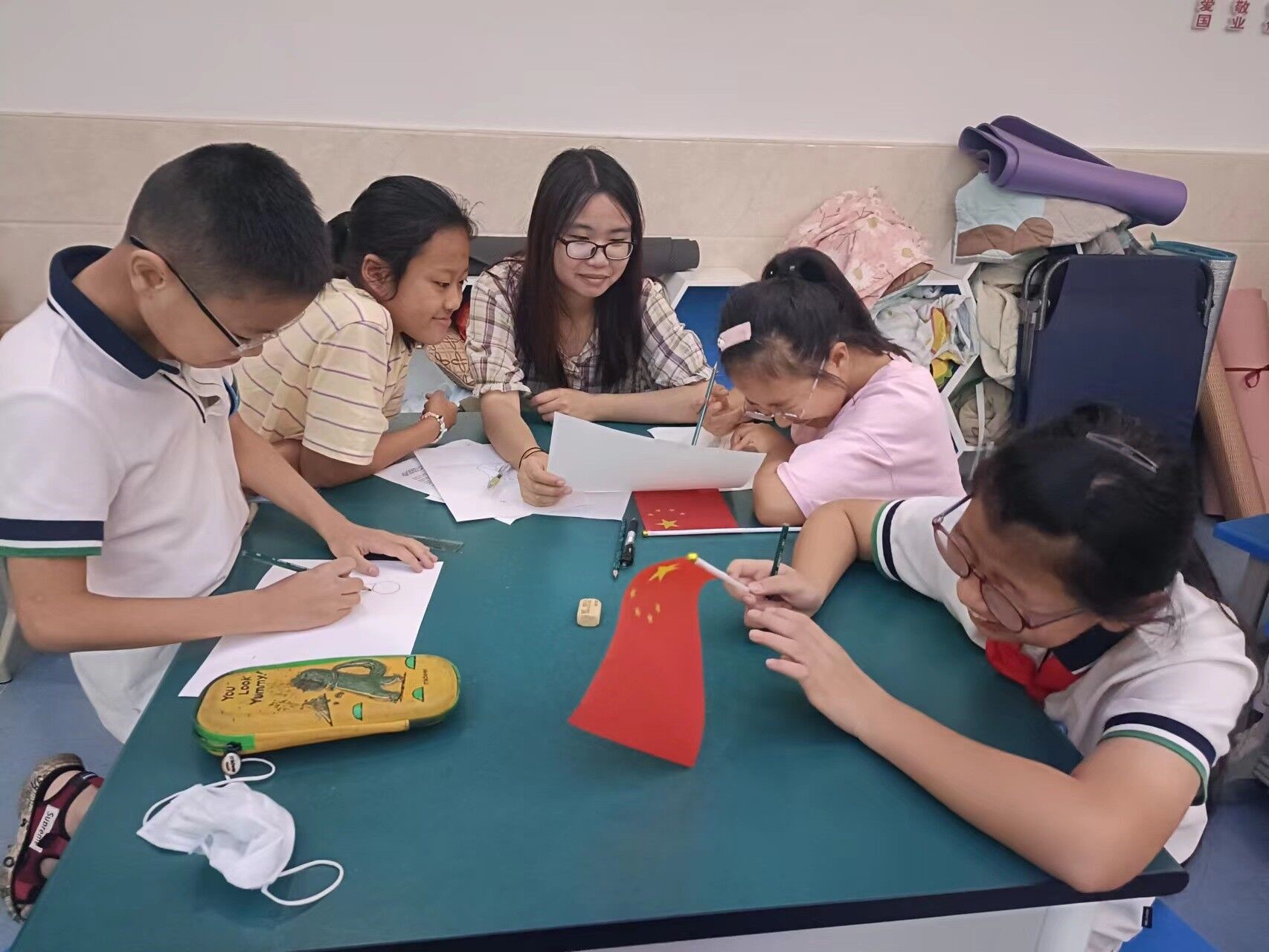 在正式课程开始前,小金老师准备的抢椅子小游戏将气氛炒热,同时引入了今天的课堂主题——红色教育。他以小朋友们平时生活中最熟悉的国旗为切入点,向他们介绍了身为温大员工的国旗设计师曾联平先生。此时庄严肃穆的国歌响起,全体小朋友们和实践成员起立齐唱国歌,在嘹亮的歌声中,往昔英杰的身影仿佛正注视着现在茁壮成长的小朋友们。之后小金老师带领小朋友们了解了少先队员、共青团员、中国共产党党员之间的不同和意义。小朋友们自豪地表示他们都是少先队员,部分小朋友还表达了自己想要加入共青团的愿望,得到了实践队员的鼓励。在之后的游戏环节里,小金老师让小朋友们举手抢答屏幕上出现的国旗所对应的国家。一只只小手高高举起,被点到的小朋友们站起来时自信大方,对答如流。当屏幕上出现中国国旗时,气氛更是迎来了高潮,小朋友们争先恐后地举手,毕竟哪怕年幼,每一个中国人都会将国旗深深地铭记在自己的心中。许多小朋友都很了解中国近代史上的大事,这在接下来的提问环节体现得淋漓尽致。之后小金老师重点讲解了近代史上的重要节点,例如建党建军、长征、抗日战争和解放战争,同时带领小朋友们观看了几个短片。中国近代史是一部苦难史,华夏儿女的铮铮铁骨,是国难当头时的奋勇前进。小朋友们被视频中坚毅果敢的人们深深震撼,在屈辱与不甘之下,这个国家是发光的,思想的光辉映在人民脸上,照进人民心里。相信小朋友们一定能体会到这段历史对全体中华人民沉重的意义,屈辱又让人热血,迷茫又让人坚定,痛苦却又不能割舍。在简单的互动环节过后,小金老师让小朋友们设计一面属于自己的国旗。小朋友们苦思冥想,在自己的画纸上留下了一个个缤纷的想象。