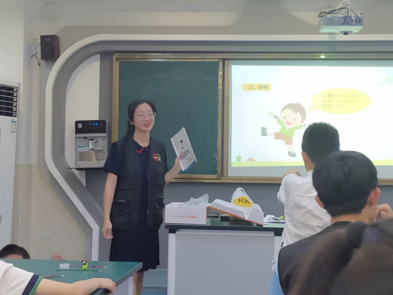 实践队的成员一到教室门口就受到了小朋友们的热烈欢迎。考虑到小朋友们刚结束午睡,小刘老师给小朋友们播放了两集英文版西游记的视频,以达到快速清醒的效果。此次授课主要围绕“电与磁之间的关系”展开。小刘老师向同学们介绍了奥斯特生平以及电与磁之间的关系。介绍完之后,就来到了激动人心的时刻——“小刘老师的实验小课堂”。为了小朋友们能快速且准确地完成实验,在实验之前小刘老师贴心地播放了操作视频和讲解实验中所需要注意的地方。并邀请了一名小朋友到讲台进行示范:连接好电池与导线并使导线和指针平行,最后闭合导线。神奇的现象出现了——指南针发生了偏转;改变线圈匝数或者增加电池节数,可以增加铁钉的磁性;这就是神奇的电生磁现象。实验过后便是课堂练习。通过一次次的问答,小朋友们对电与磁的概念与关系更加深刻。实验结束后,小朋友们自觉地上交图钉等尖锐危险物品并收拾了桌上的垃圾。在结束了趣味盎然的实验后,小朋友们在实践队成员的监督下背诵古诗来换取你真棒印章。小朋友们也会请教实践队成员他们不会的题目,实践队成员也耐心的教导他们。