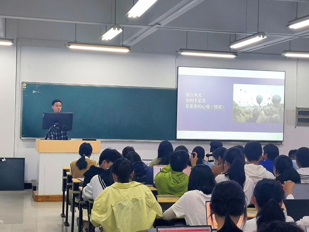 首先由陈瑞鑫老师为同学们讲述宣传技能中的摄影技能——利用手机拍摄旅游风光。陈老师提出拍摄讲究“远观其势,近取其质”,即要做到整体布局和局部特写的观点,让同学们打开摄影的新大门。陈老师讲到拍照不是单纯地拍风景,更是拍出一种心境。倘若拍的是风景,那就是千篇一律的风景图;倘若拍的是心境,那么就如“一百个读者就有一百个哈姆雷特”,不同的心境下,每一张照片都是独一无二的。最后,陈老师强调对照片的后期处理不是作假,而是回忆。因为眼睛看到的和拍到的有出入,才需要对照片进行后期处理,使其成为眼睛看到的模样。