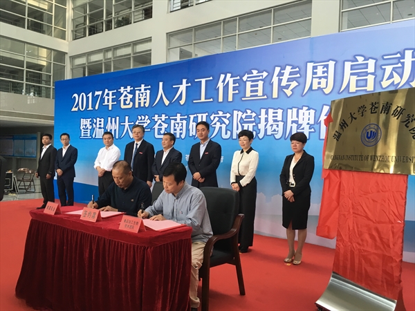 11月3日下午,在苍南县行政中心一楼大厅,2017年苍南人才工作宣传周启动,永利集团官网苍南研究院同日揭牌。苍南县委副书记胡长虹主持仪式,永利集团官网董事长李校堃,副董事长、苍南研究院经理钱强,部分教师代表及苍南县部分领导出席仪式。