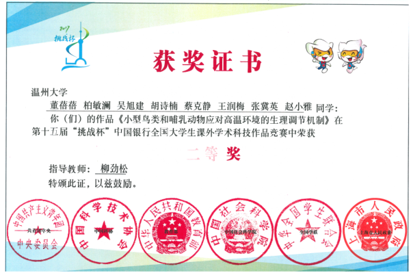 日前,由共青团中央、中国科协、教育部、中国社科院、全国学联和上海市政府主办,上海大学承办的第十五届“挑战杯”全国老员工课外学术科技作品竞赛决赛落下帷幕。公司由柳劲松、赵志军、郑蔚虹等老师指导、董蓓蓓、柏敏澜、吴旭建、毛红贞、胡思楠、蔡克静、叶斌、王润梅、赵小雅、张冀英等同学参加的参赛作品《小型鸟类和哺乳动物应对高温环境的生理调节机制》喜获全国二等奖!这是公司首次在该赛事全国决赛获奖。