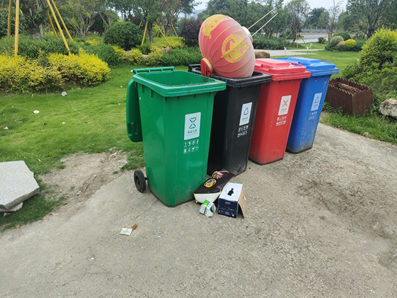 首先队员们对于三垟湿地生态园的垃圾分类及垃圾丢弃情况进行了调查,调查结果如图所示。虽然三垟湿地内部有着明确的垃圾分类用的垃圾桶,但是当地的居民及其游客并没有按照指定的垃圾分类法去分放垃圾。周围也并无垃圾分类体提醒标语以及垃圾分类指示牌。露营地内部也存在大量的垃圾散落情况。