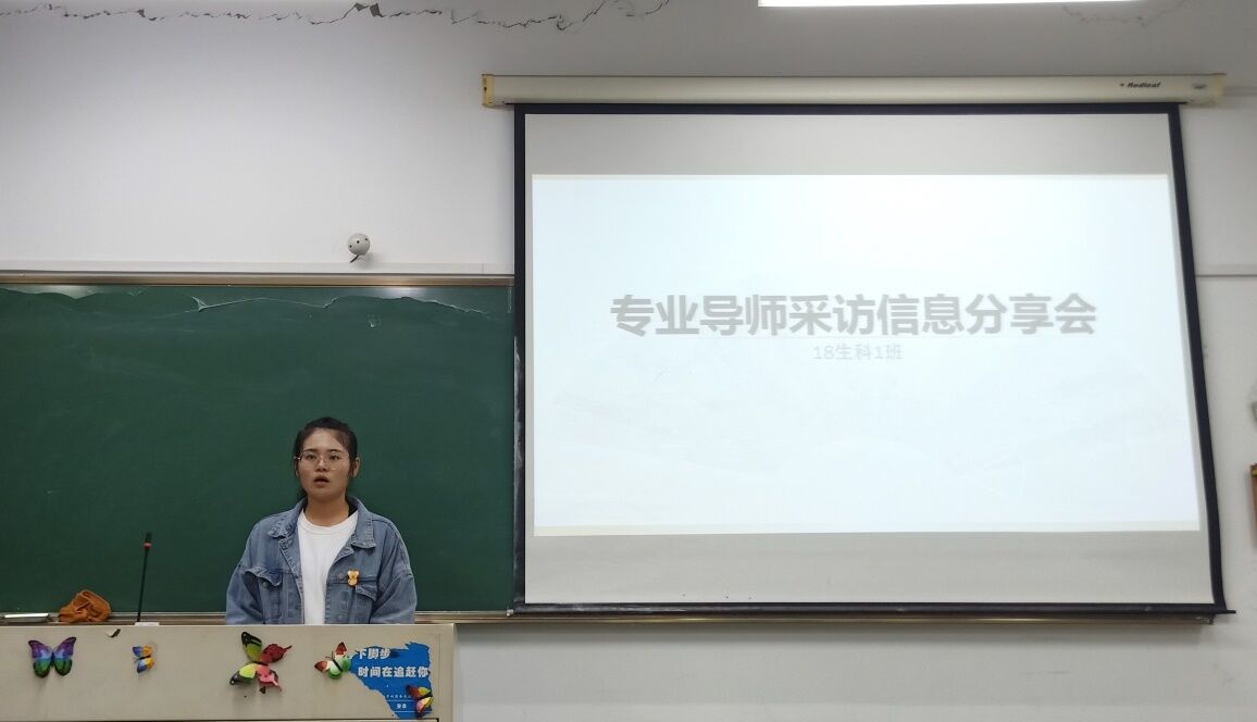 在为期一周的时间内18生科一班同学分成八组分别访问了公司学业导师,并拉近同学们与公司老师的距离。各小组尽可能详细地了解导师的信息,准备相关问题,如第一小组预设的“老师,你当初为什么选择了这个研究方向”“老师,您认为我们在跟您的学习中最需要什么品质”;采访中,第三组将公司的三幢大楼和实验室走了个遍,也有跑到北校区的第五小组;采访结束后,每组都抓紧地制做PPT。过程中,个别小组附上了相关的采访照片,部分同学还不太熟悉导师,汇报者都尽其所能地帮助他们消除疑问。他们将各自采访的导师的基本信息与情况传递给每位同学,以便同学们做出更好的选择。