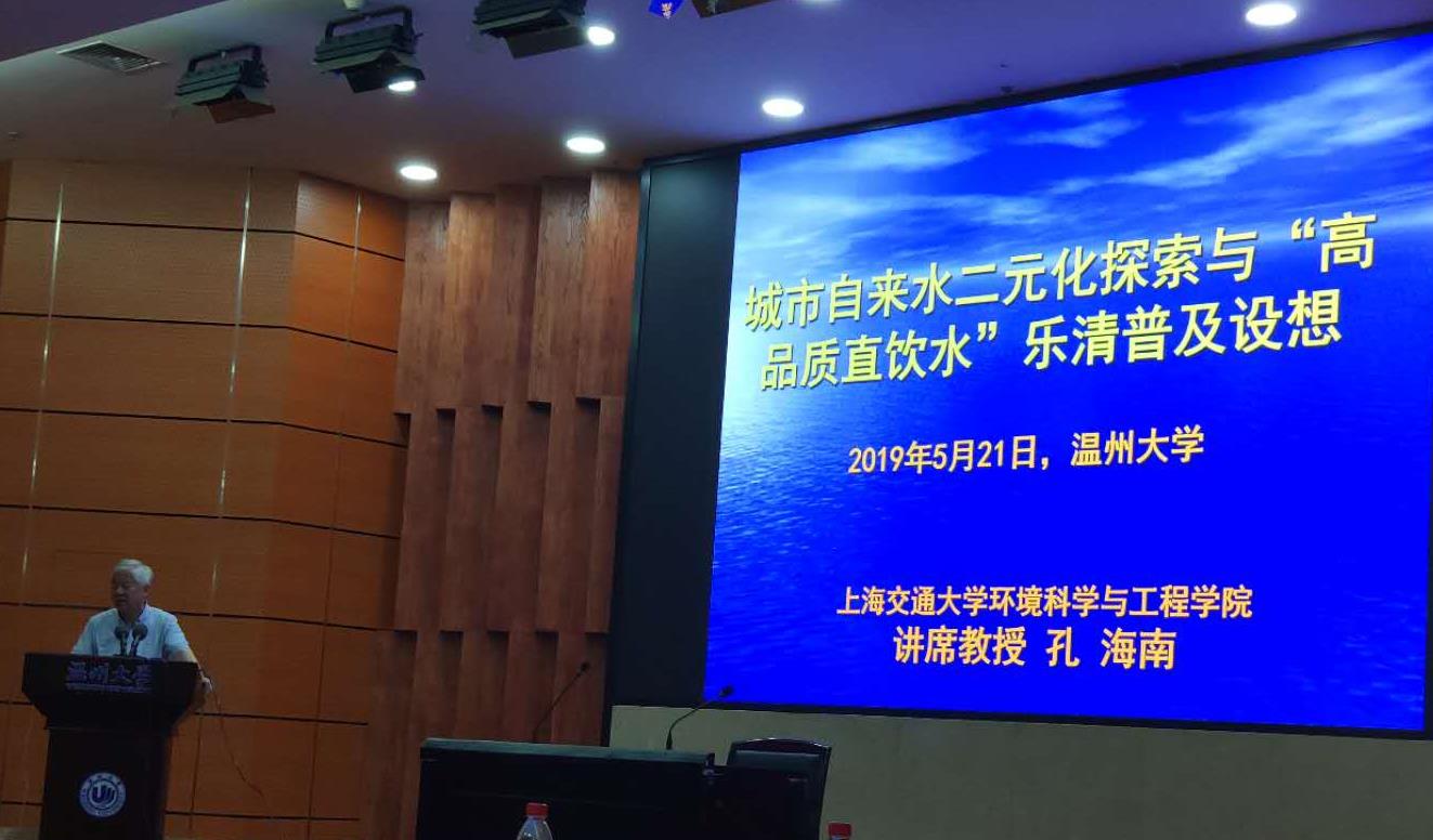 孔海南教授的讲座主题为“城市自来水二元化探索与‘高品质直饮水’乐清普及设想”。他从我国城市自来水从源头到龙头“三重污染”的污染链出发,阐述了我国饮用水的水质现状。我国自来水污染主要存在源头污染、自来水厂加工过程污染及管道输送过程污染三大重污染,而要解决饮用水问题必须贯彻“从源头到家庭水龙头”全方位开发饮用水安全技术的方针,规划新的技术路线,从水源选址到管道选材和铺设都要严格把控。实现高品质直饮水项目不需要对所有水提标,只要建设总水量1%的“高品质饮用水系统”就可以确保市民的饮用水安全。孔教授详细介绍了“世界第一宜居城市”维也纳市“高品质山泉水”的典型案例,并介绍了课题组由此获得启示做的大理市二元供水项目,最后由远及近,提出了雁荡山优质山泉水-直引山泉水的项目设想。