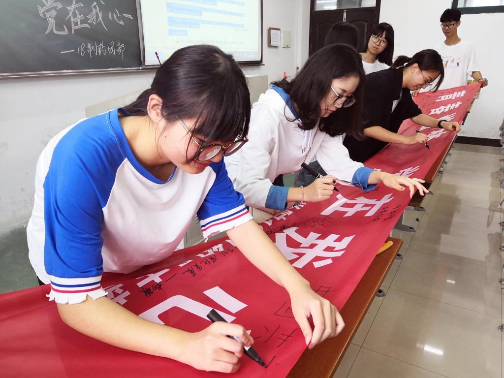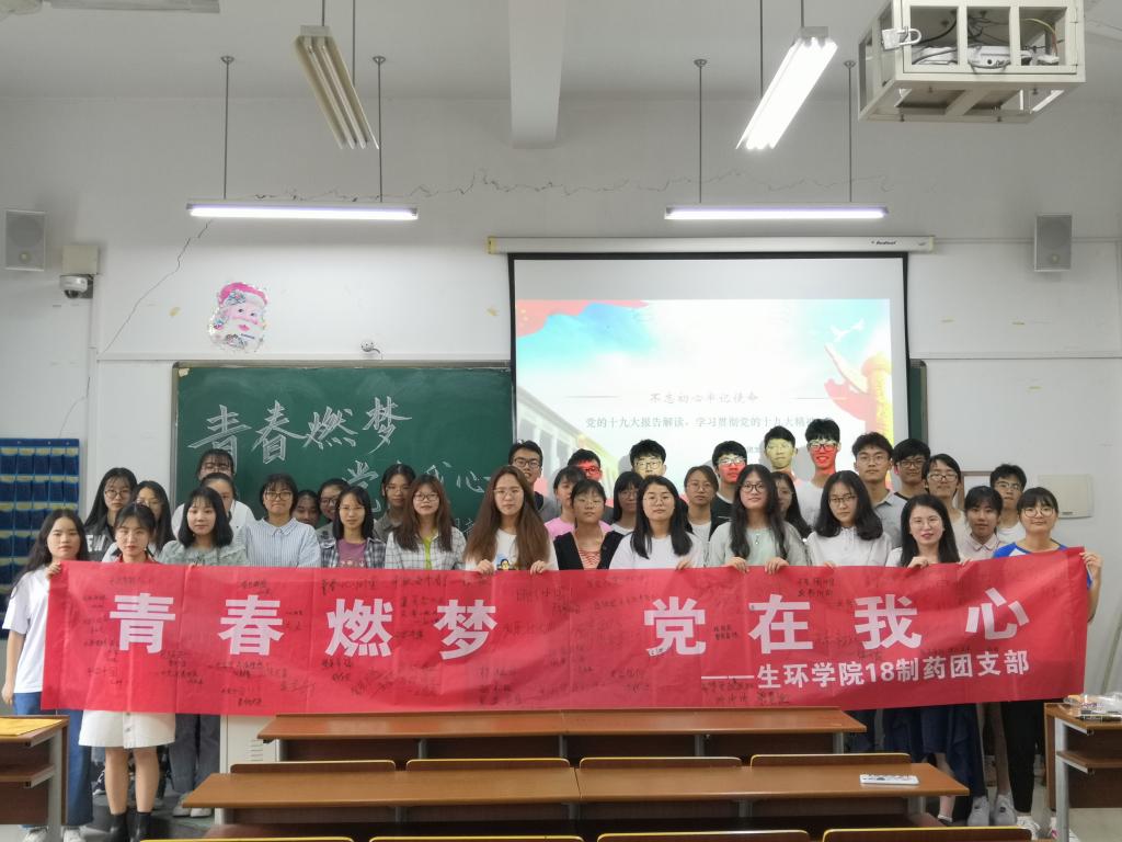 下午2点,18制药的全体同学齐聚南11-201教室,开展本次“青春燃梦,党在我心”团日活动。首先,由文体委员陈洋领唱团歌《光荣啊!共青团》,在同学们响亮又充满青春活力的歌声中拉开了本次团日活动的序幕。紧接着,又在老团员朱怡婕同学的带领下,与同学们重温入团誓词。接下来,团支书字一薇给同学们讲解了中国共产党第十九次全国代表大会的精神内涵和习近平新时代中国特色社会主义思想,观看视频《迈进新时代,开启新征程》,让同学们了解到一代人有一代人的使命,而我们这代人的使命就是要为实现中华民族伟大复兴的中国梦而奋斗!观看视频《习近平同志在纪念五四运动100周年大会的重要讲话》,明白了新时代中国青年要锤炼品德修为。接下来欣赏了由同学们组织的节目,诗歌朗诵《致奋斗》、《祖国啊,我亲爱的祖国》,还有韩影同学带来的精彩魔术表演《我的祖国和扑克》。最后,进行了有关十九大报告与习近平新时代中国特色社会主义思想问题的知识竞答,同学们争先作答,答对者还领取到了团日活动纪念小礼品。活动最后,同学们纷纷在横幅上写下自己对党组织的期望与祝福也表达了对此次党团日活动的肯定。以“青春心向党,争做奋斗者”的高声呐喊,结束了本次活动。