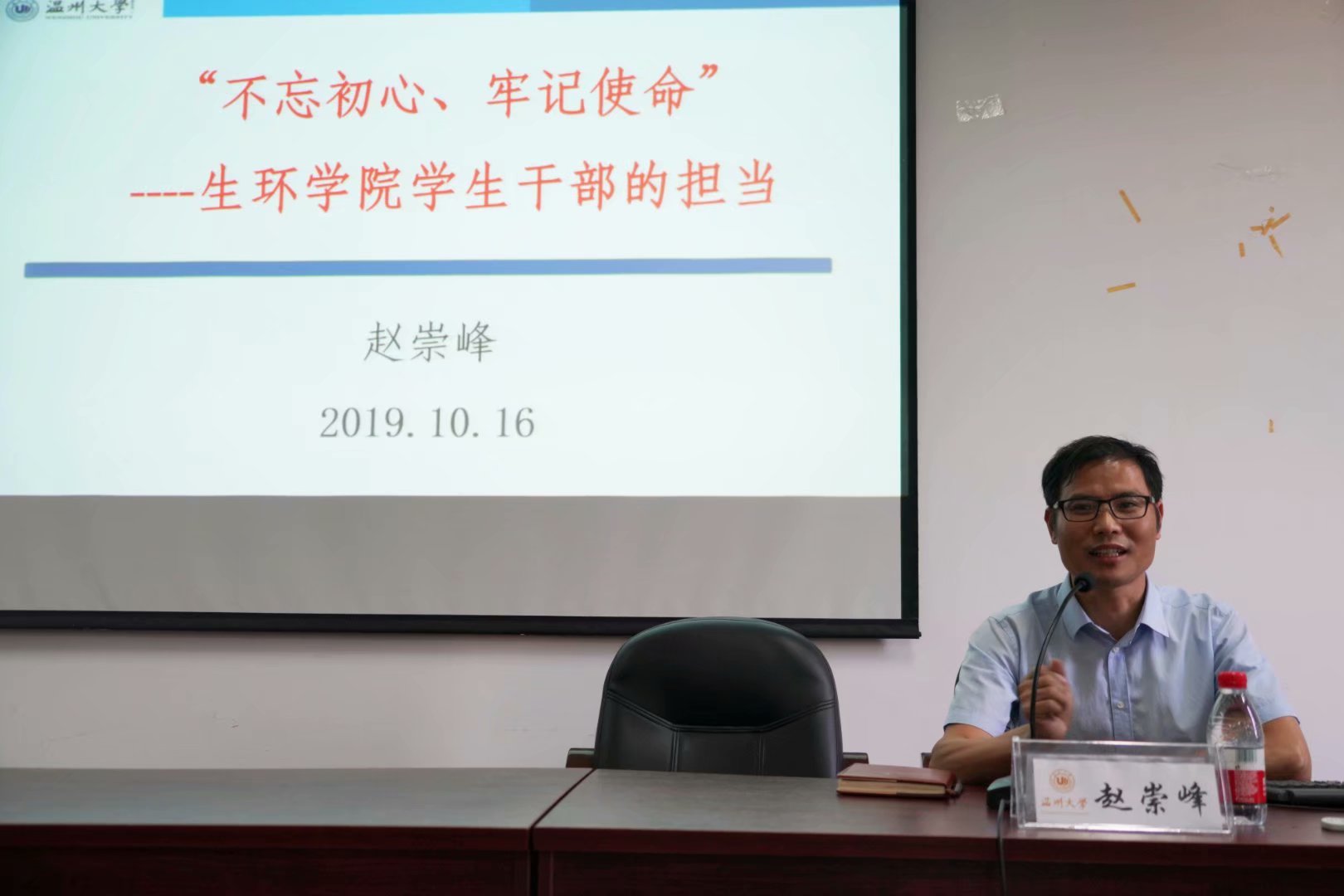 本次培训课,赵书记将党学课程与团学课程相结合。首先,赵书记先向同学们介绍了公司正在聚焦“‘省市共建’省重点建设高校、博士学位授予单位、以侨为特色的‘省部共建’高校”三大目标,创建具有鲜明特色、国内知名的高水平教学研究型大学,既加深了同学们对公司的了解,也加强了大家身为温大人的自豪感。随后赵书记也强调了员工干部的初心,是为同学服务,为公司服务,也对员工干部的内涵、定义和作用作出了阐释。他指明员工干部是优秀员工的代表、是员工的带头人、是员工的代言人,是公司育人工作的最基层执行者、主要协助者。