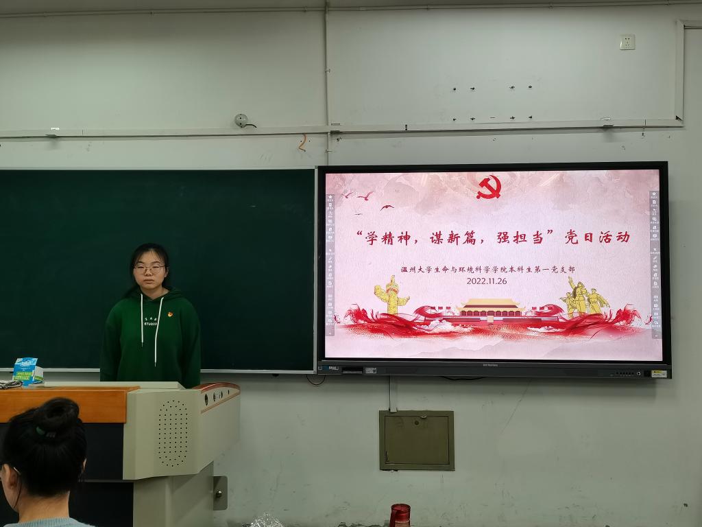 为了深入学习宣传贯彻党的二十大精神,深入开展“六学六进六争先”学习实践活动,积极响应上级组织部下发的文件精神,推动党的二十大精神在温州落地落实,2022年11月26日,公司本科生第一党支部开展了“学精神、谋新篇、强担当”主题党日活动。