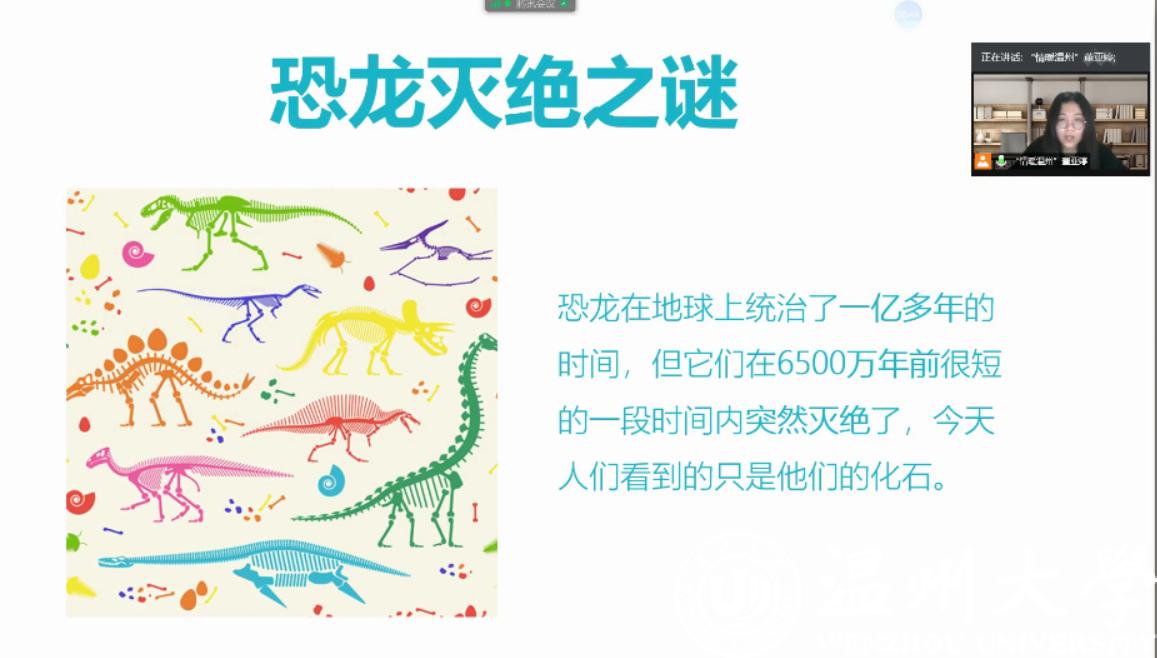 第一节课开始,董亚婷老师从恐龙灭绝的原因与恐龙多样种类的分享给小朋友们展现了恐龙这种神奇的生物。董老师的话语简短有力,要点突出,讲解时穿插着卡通动画和有趣的图片,最后给小朋友们布置了课堂作业。第二节课是蔡梦瑶老师带领小朋友们探索植物世界。在课堂的开头,老师播放了一段动画短片,介绍了植物的分类。之后,老师介绍了一些神奇的植物,围绕着它们的样貌、习性等特点,让小朋友们领略了植物世界的千姿百态。最后,老师介绍了一些植物的花语并在课堂上留下了课后小作业。第二部分线上会议队长向实践队成员们讲解了本次科普行活动,梁老师告诉实践队员们今年由“情暖温州”暑期社会实践队报名参加其中的“志愿行动在社区”活动,以线上线下相结合的方式,通过科普宣讲的形式去开展。同时,梁老师也希望实践队员们能再接再厉,在往后的工作中能把这个科普活动贯穿到实践队的活动中去,丰富内容,提升成果。