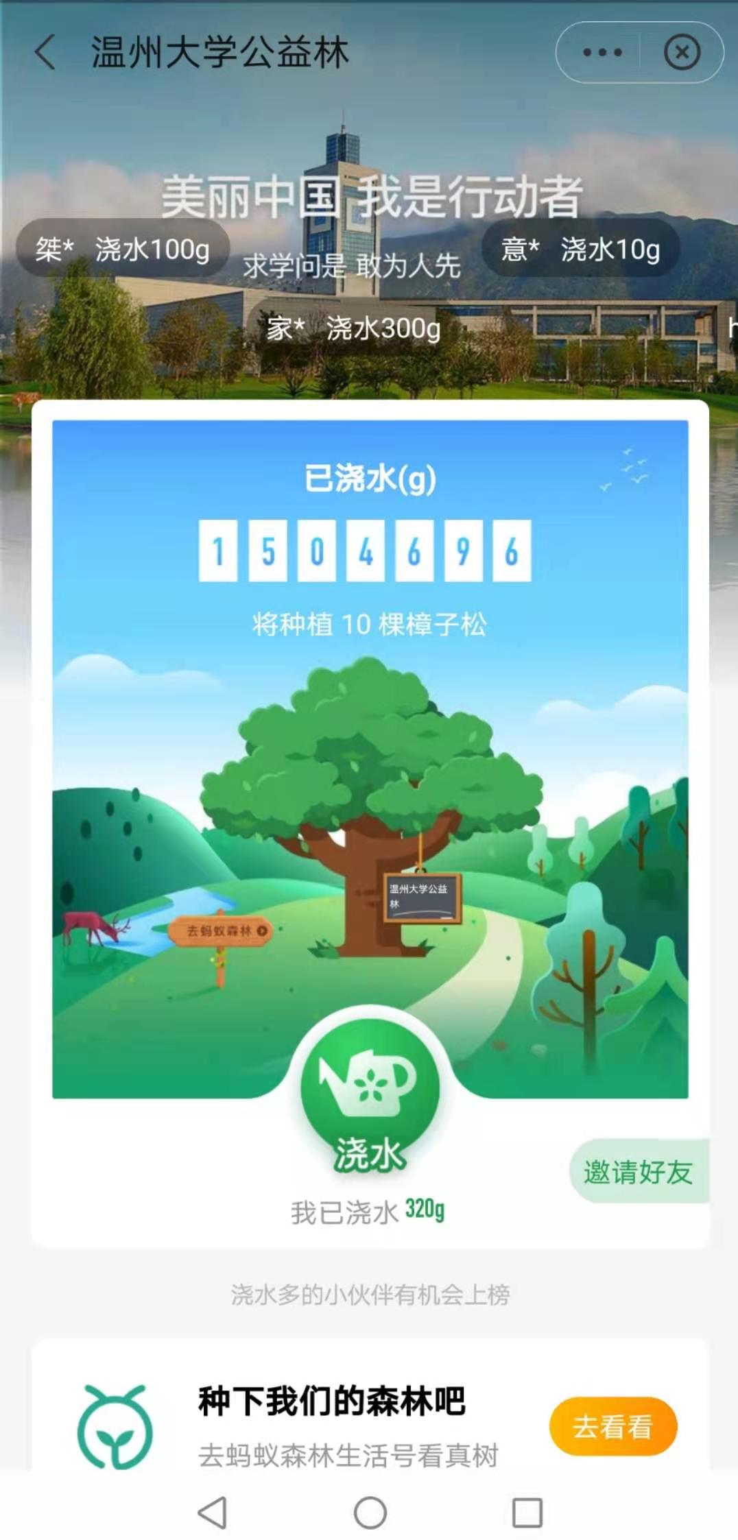 除此之外,公司师生在网络上发起“云浇水”的号召。依托支付宝—蚂蚁森林公益林平台,鼓励全校师生为“永利集团官网公益林”浇水,成为建设美丽温大、美丽中国的行动者。