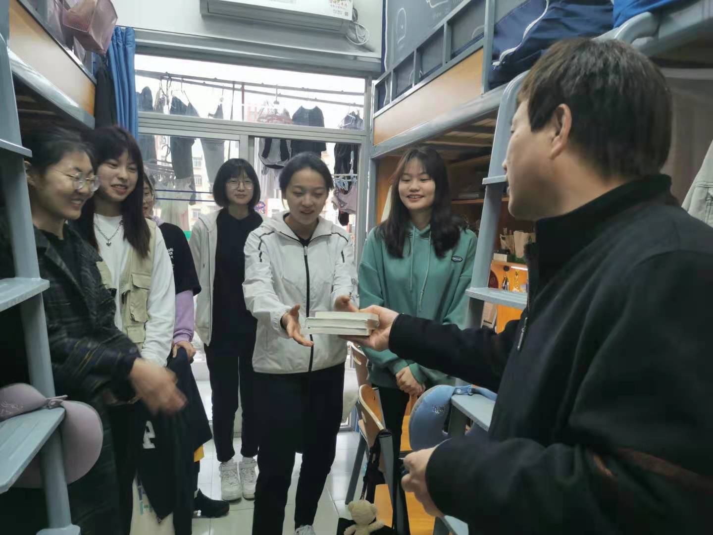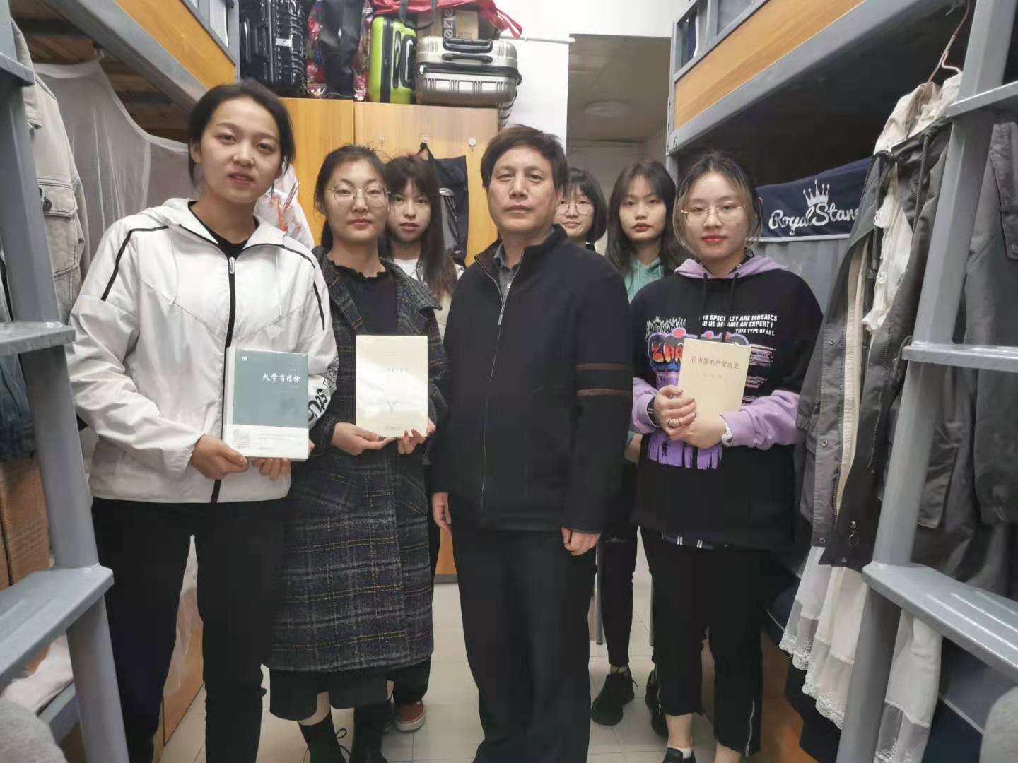 在交谈中,杨书记对同学们送去了生活上的关怀,询问同学们的家乡以及考研想法,勉励大家朝着更优秀的目标前进。其次谈到了党员员工干部的职责定位,告诫同学们要珍惜为人民群众服务的宝贵机会,起到党员员工干部的先锋模范作用。杨书记还提到,在学习工作之余,要注意劳逸结合,养成良好作息习惯,加强体育锻炼、增强体质,做到全面发展。在最后,杨书记向同学们送去了《大学有精神》、《大学的人文教育》、《论中国共产党历史》三本书,鼓励同学们多学党史,牢记使命,继承和发扬爱国主义精神。