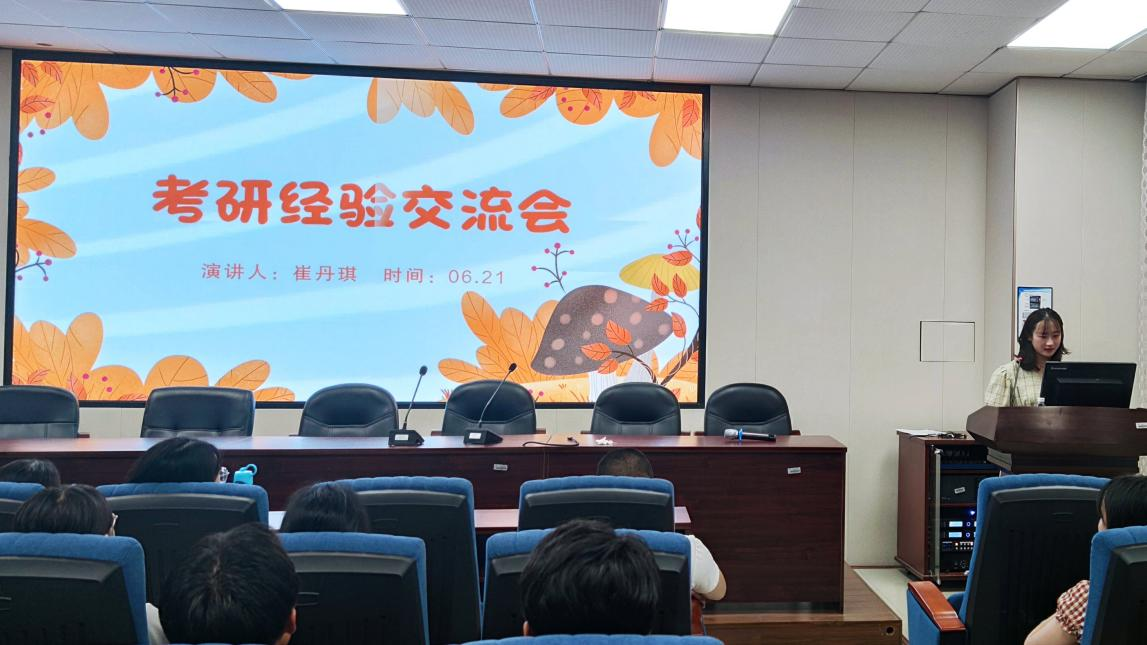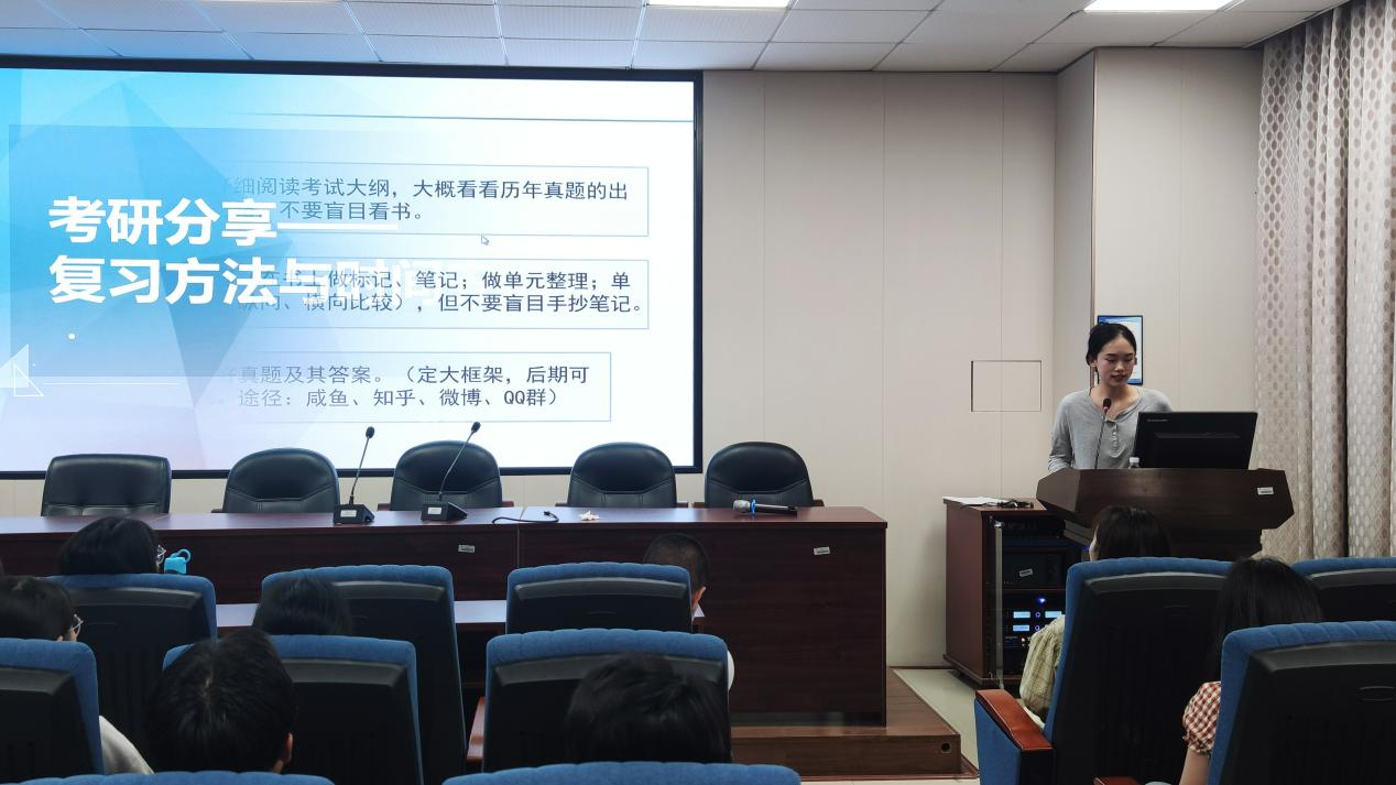下午3点半,分享会正式开始。叶飘飘学姐从专业课、英语、政治三方面入手,向同学们展示了自己的复习规划,并就长期计划(6个月)、中期计划(1个月)、短期计划(1周)的具体安排给出了建议。其后,崔丹琪学姐以“考研方向>心态>方法>努力>坚持”为纲,向同学们分享了备考过程中心态的调适方法,强调“考研一定要不骄不躁、不急不忙,相信努力坚持的意义”。之后,葛静茹学姐向同学们分享了考研复试及面试准备的一些方法,并祝福大家能一战成硕,早日将这些面试方法学以致用。