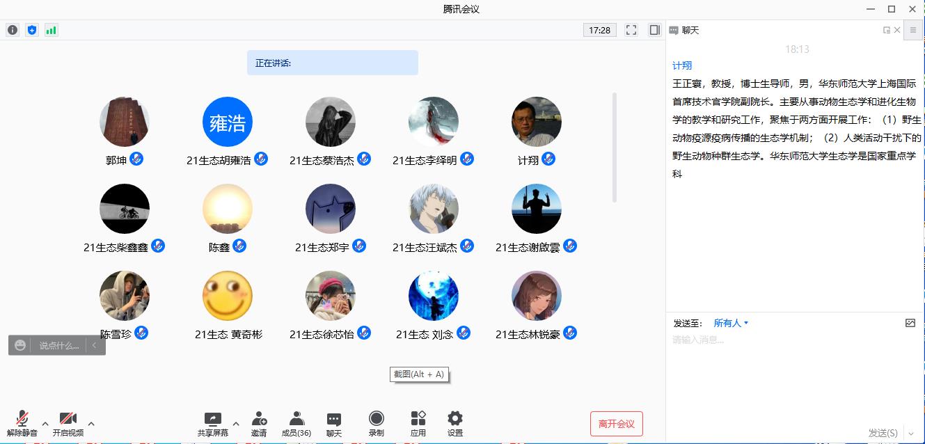 为了让生态学专业的同学们对生态学专业知识以及相关领域有一个更加全方面的了解和认识,公司邀请华东师范大学王正寰教授和南京师范大学李宏教授为21级生态学专业的同学进行线上宣讲活动。此次会议分别于12月23日和24日下午18:30举行了两场,生态学专业负责人计翔教授及21级生态学班班主任、全体同学参加本次会议。