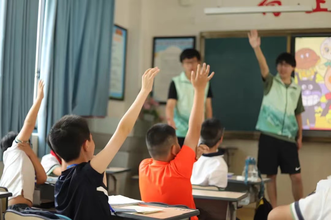 在前往茶山附属实验小学之前,负责人老师提出三点要求:一、着装得体大方,不能穿拖鞋、背心入校;二、要注意课堂纪律和员工安全;三、队员和班主任老师之间要及时反馈和沟通。首先是由沈逸同学进行破冰活动,通过五个小游戏,让小朋友之间快速熟悉起来。其中“我是谁”活动中,每个小朋友举手到讲台上面向大家做自我介绍,分享自己喜欢的书和电影。随后的“你画我猜”活动更是把破冰气氛推向高潮,“老师老师,你能猜出我画的是什么吗?”小朋友争先恐后地向实践队成员展示自己的图画,沈逸同学也将小朋友的画投屏到黑板上让全班小朋友一起来猜,大家玩得不亦乐乎。接着由陈可欣同学进行“猜猜我是谁——认识动植物”主题课程,在陈可欣同学的带领下,小朋友学习了玫瑰和月季的区别,欣赏了身边不同植物的特殊形态,了解了动物类别的丰富多样,感受了美妙的动植物世界。在陈老师生动幽默的讲解中,每位小朋友认真听讲,举手抢答老师提出的问题,赢得阵阵掌声。