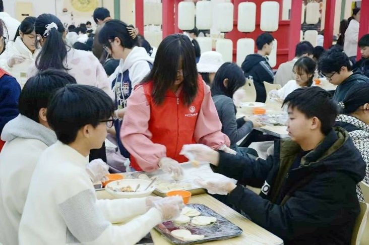 包好的饺子随后被送入厨房煮熟。经过一段时间的等待,热气腾腾的饺子端上了桌。同学们围坐在一起品尝自己亲手制作的饺子,期间也不忘拍照留念,记录下这一充满成就感的时刻。