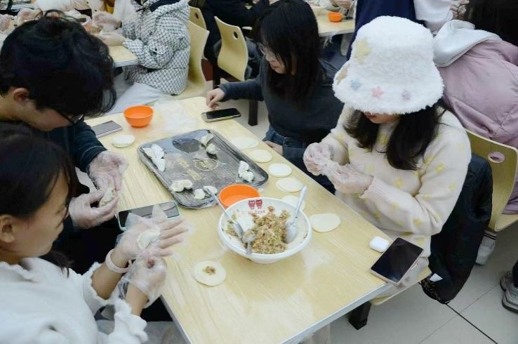 活动伊始,同学们迅速分组,每组6-8人,围坐于摆满食材的餐桌旁。随后,在工作人员的有序组织下,大家纷纷动手,从拿饺子皮、包馅到捏合,动作娴熟,全神贯注。过程中还不时交流技巧,现场气氛热烈且井然秩序,工作人员也实时拍照记录这一温馨场景。