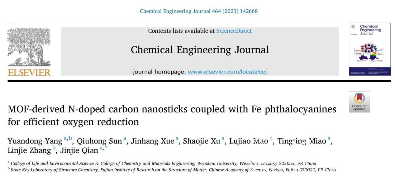 本论文以“MOF-derived N-doped carbon nanosticks coupled with Fe phthalocyanines for efficient oxygen reduction”为题发表在《Chemical Engineering Journal》上。永利集团官网为第一通讯单位,化材公司钱金杰副教授为通讯作者,第一作者为公司2021级硕士研究生杨远东。该工作受到国家自然科学基金(21601137)、浙江省自然科学基金(LQ16B010003)、温州市基础科学研究项目(H20220001,G20190007)、云南省地方本科高校基础研究联合专项重点项目(202101BA070001-042)等项目资助。