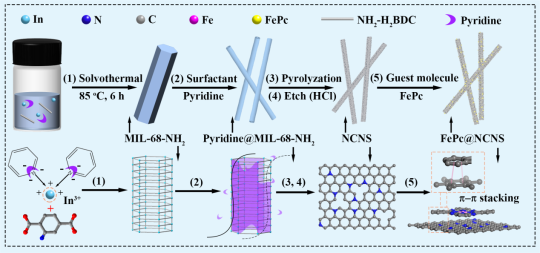 MIL-68-NH2衍生FePc@NCNS多孔碳纳米材料的合成示意图