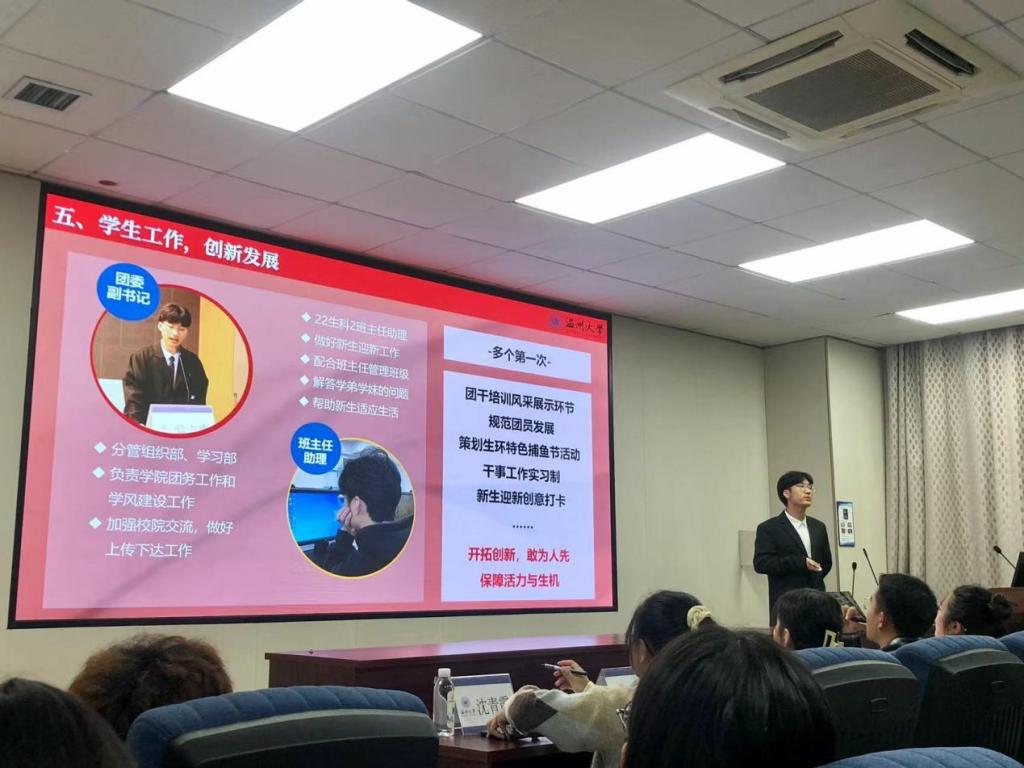 首先,陈瑞鑫老师为评委和观众讲解了“学习标兵”和“优良学风班”的评奖规则,并激励大一新生争当学习标兵、勇建优良班级、在提升自身素养的同时也力争为班级建设贡献一份力量、进而积极推动公司学风建设。