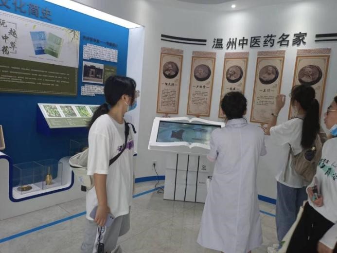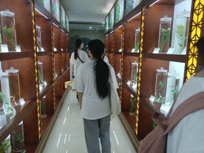 首先,中药专家陈主任带领实践队参观室外栽培各种中药的百草园。百草园的中药品种非常多,陈主任挑选了其中常见的品种进行了重点讲解,例如,温六味中的铁皮石斛和栀子花,温州七肾中的红对叶肾和龙芽肾,两面针等。参观完百草园后,实践队分为两组,在工作人员的带领下,一组先去往一楼的食品药品安全科普体验中心,而另一组则前往二楼参观药品实验室。一楼的食品药品安全科普体验中心的参观内容主要分为四大板块,分别是关于本研究院的介绍、瓯越医药文化简史、各种温州药材的标本、AR互动展示区。队员们依次进行参观,了解了许多关于中药的知识。二楼的药品实验室主要分为中药实验室和西药实验室。在工作人员的带领下,队员们参观了各类先进的机械仪器,了解了它们的使用方法及功能。在中药实验室中,队员们也参观了中药的标本室,其中的标本不仅仅只是中草药,还有动物皮毛、各类矿物。参观完后,实践队两组会合,离开了温州药品食品安全科普基地。