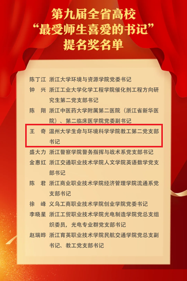据悉,本次评选活动由浙江省普通高公司党建研究专业委员会、浙江教育报刊总社联合组织开展,从全省高校选树一批政治素质好、党建能力强、工作业绩突出、教师员工喜爱的高校基层党组织书记先进典型,共评出“最受师生喜爱的书记”10名和“最受师生喜爱的书记”提名奖10名。