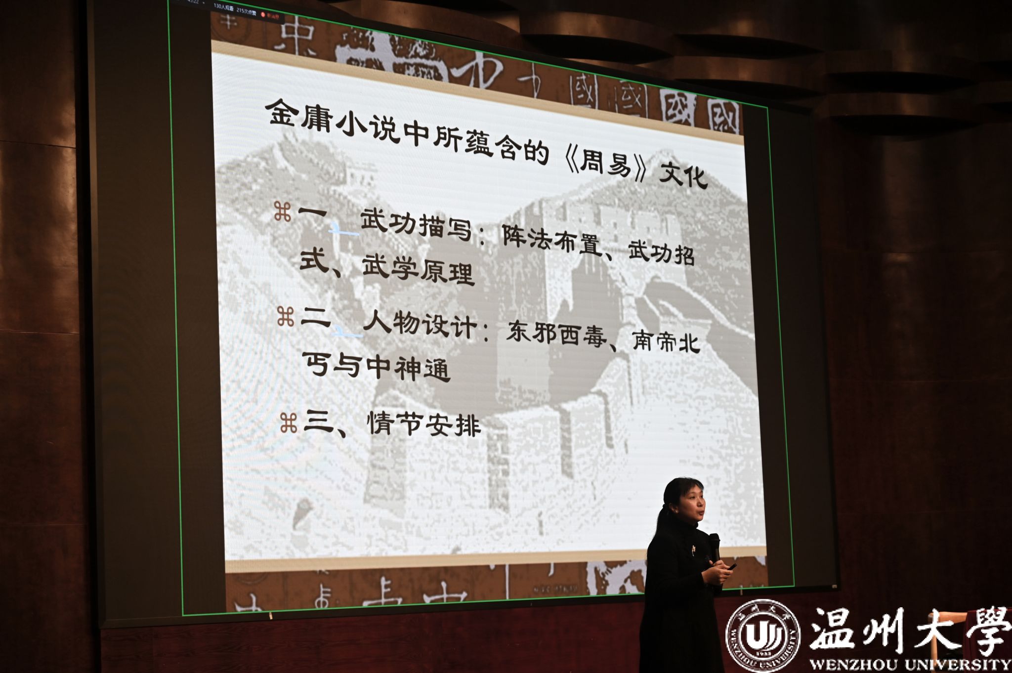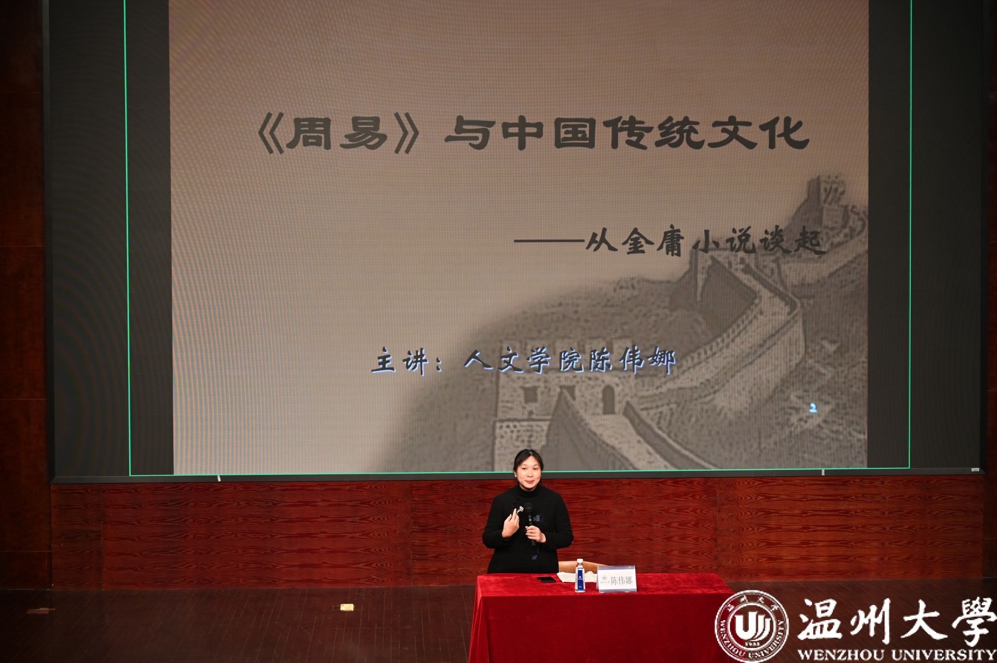 陈伟娜老师首先从文化的概念引入《周易》,让我们对《周易》的属性有了一定认识。其次又以蝙蝠、谐音文化以及筷子文化为例让我们认识到《周易》与我们的日常生活息息相关。紧接着陈老师又将金庸小说中的武功描写、人物设计和情节安排与周易文化相结合,叙述风趣、引人入胜,促使我们对《周易》产生了更近一步的思考。最后陈老师对《周易》的文化史地位以及它对传统社会的影响做出总结,提出《周易》对古今取名的影响以及由《周易》衍生出的成语,让我们看到了《周易》作为中华文化的结晶对中华文化和世界文化的影响。