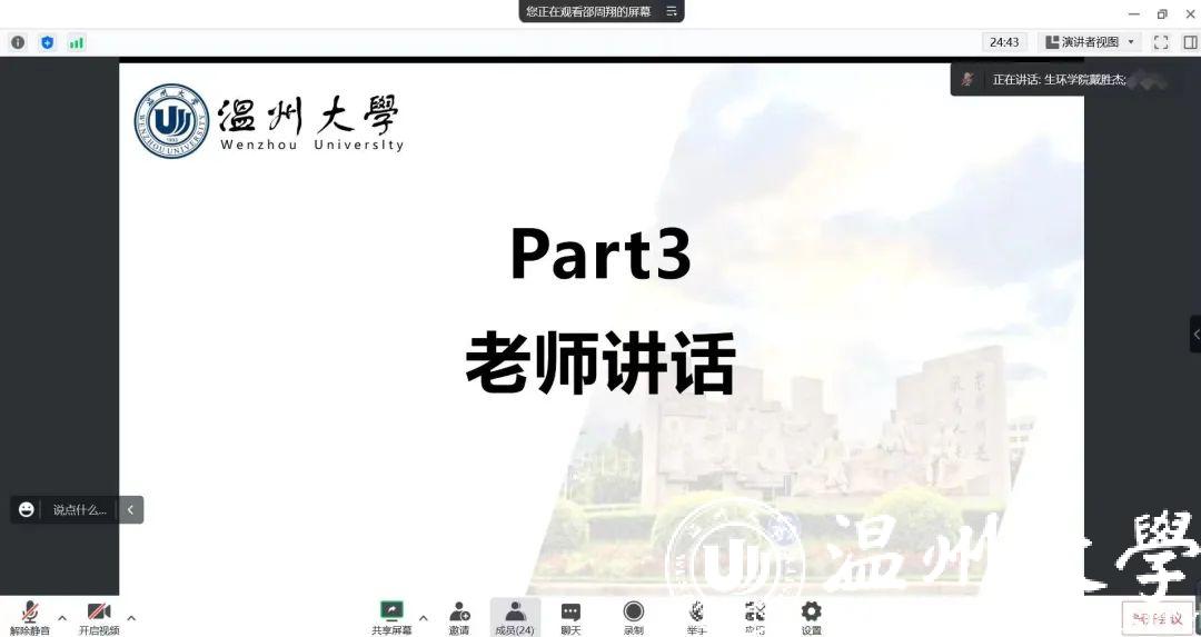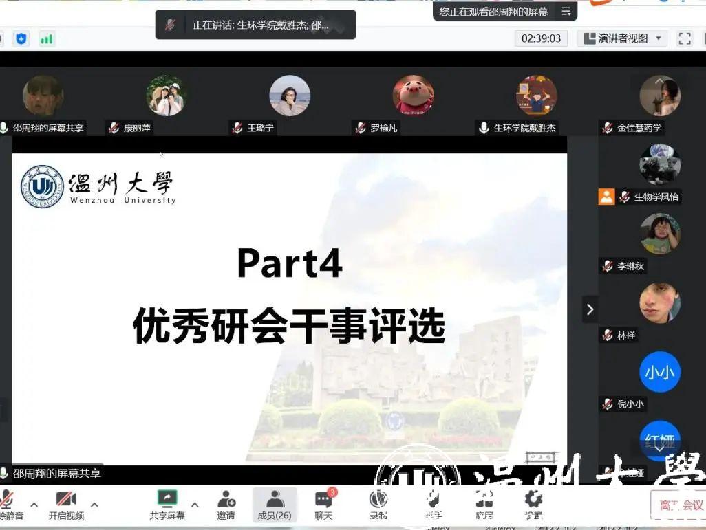 12月24日18:00公司研究生会第四次工作例会暨优秀干事评选大会顺利举行。公司研究生辅导员戴胜杰老师出席会议,2022届公司研究生会全体成员参加会议,本次会议由办公室干事邵周翔主持,因疫情原因,会议以线上形式召开。