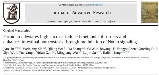 近日,yl永利集团官网登录佟海滨课题组揭示褐藻活性成分Fucoidan(岩藻聚糖硫酸酯)通过重塑肠道干细胞增殖与分化稳态改善代谢异常的分子机制,该研究成果Fucoidan alleviates high sucrose-induced metabolic disorders and enhances intestinal homeostasis through modulation of Notch signaling发表在《Journal of Advanced Research》(综合性期刊,1区Top,影响因子11.4)。