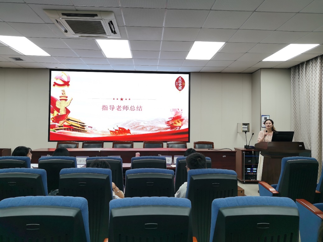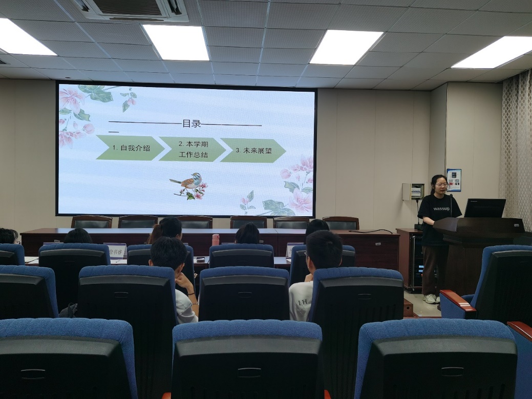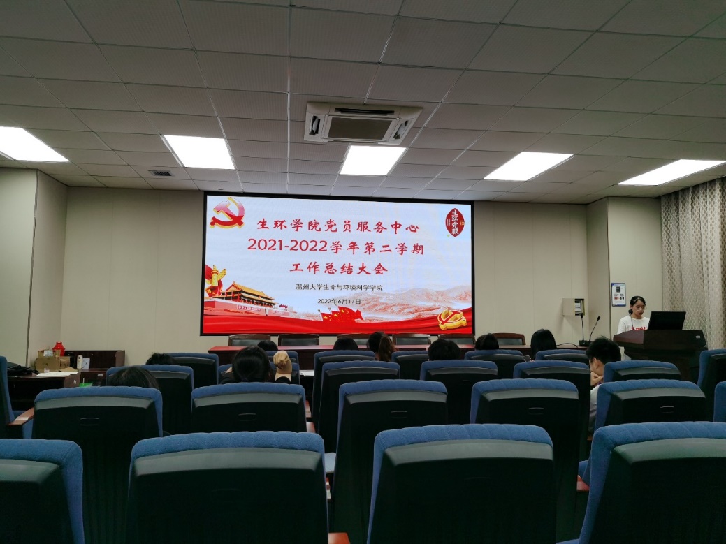 会议伊始,全体成员奏唱国歌。接着,举办2021-2022学年第二学期工作总结大会,由办公室、活动部、网宣部、义工部各部门代表依次上台对本学期的工作进行汇报。汇报人汇报了本学期部门的工作内容,回顾了各自部门在本学期取得的工作成果,总结了在工作中出现的不足之处,并对下学年工作进行了展望。接着,主持人宣读本学期党服评优名单,由指导老师赵舒展为获评优秀的部门和个人颁发奖状。