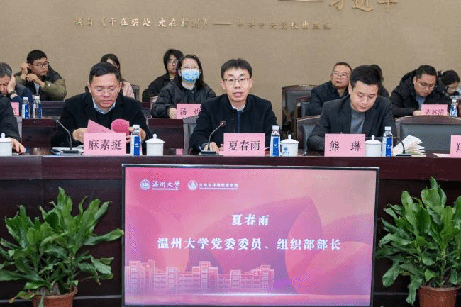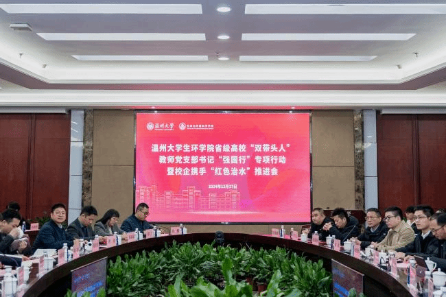 为进一步发挥党建引领的教师党支部示范作用,深化校企合作联学共建,将“红色力量”转化为高质量发展的“绿色引擎”,12月27日下午,永利集团官网省级“双带头人”教师党支部书记“强国行”专项行动暨校企携手“红色治水”推进会在南校区岩松堂白鹿厅举行。永利集团官网党委委员、组织部部长夏春雨,温州市生态环境局副局长麻素挺,温州市环境科学学会秘书长任一力,合作企业代表,校科技处、地方合作处等职能部门负责人,公司领导班子成员及师生党员代表出席大会,大会由公司党委书记李祖祥主持。