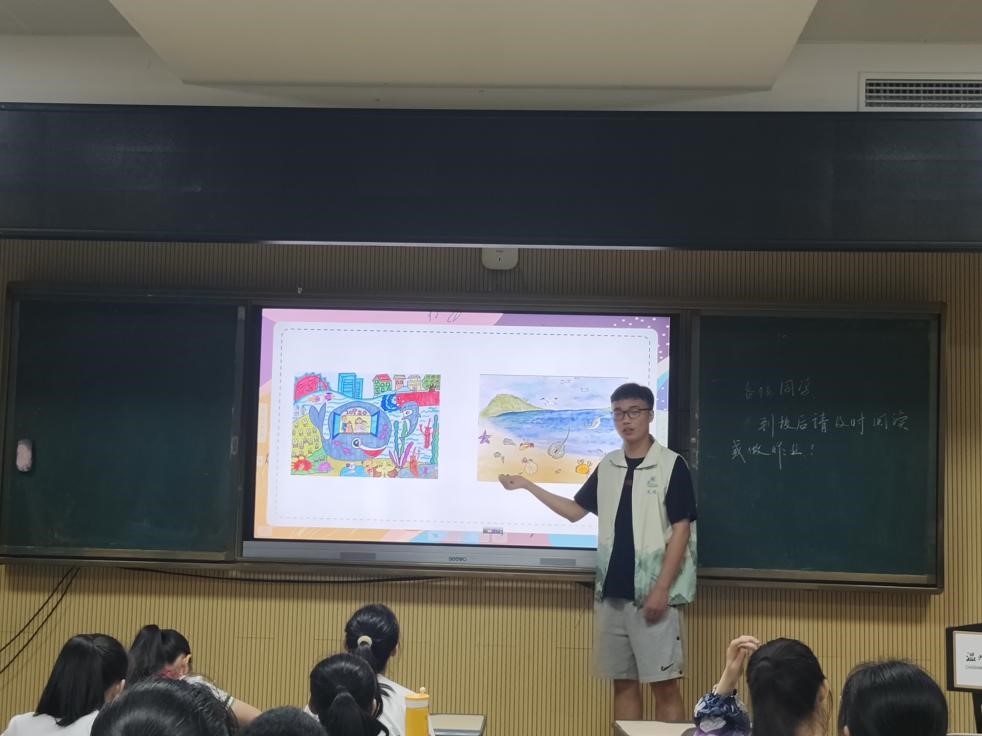 上午8:30,为加深同学们的地球保护意识,行动组的金暄婷及钟宇枫同学为小朋友们开展了“小小艺术家——绘画地球”小课堂,以神奇的陆地、隐秘的海洋和种类繁多的动物为他们描绘了一幅缤纷多彩的地球图卷。实践队队员通过一张张放映出的生动PPT讲解了地球的生态,在此过程中小朋友们发出惊叹,感叹着大自然的鬼斧神工,这使小朋友们保护地球的意识更好地得到了提高;同时,他们也期望在共建绿色星球的道路上贡献自己的一份力量。在讲解后,小课堂进入了“地球设计师”的趣味活动,由实践队成员带领,一起绘画心目中的绿色地球。活动中小朋友们积极踊跃讨论,天马行空绘画。这一幅长卷见证了小朋友们对地球母亲无尽的爱。