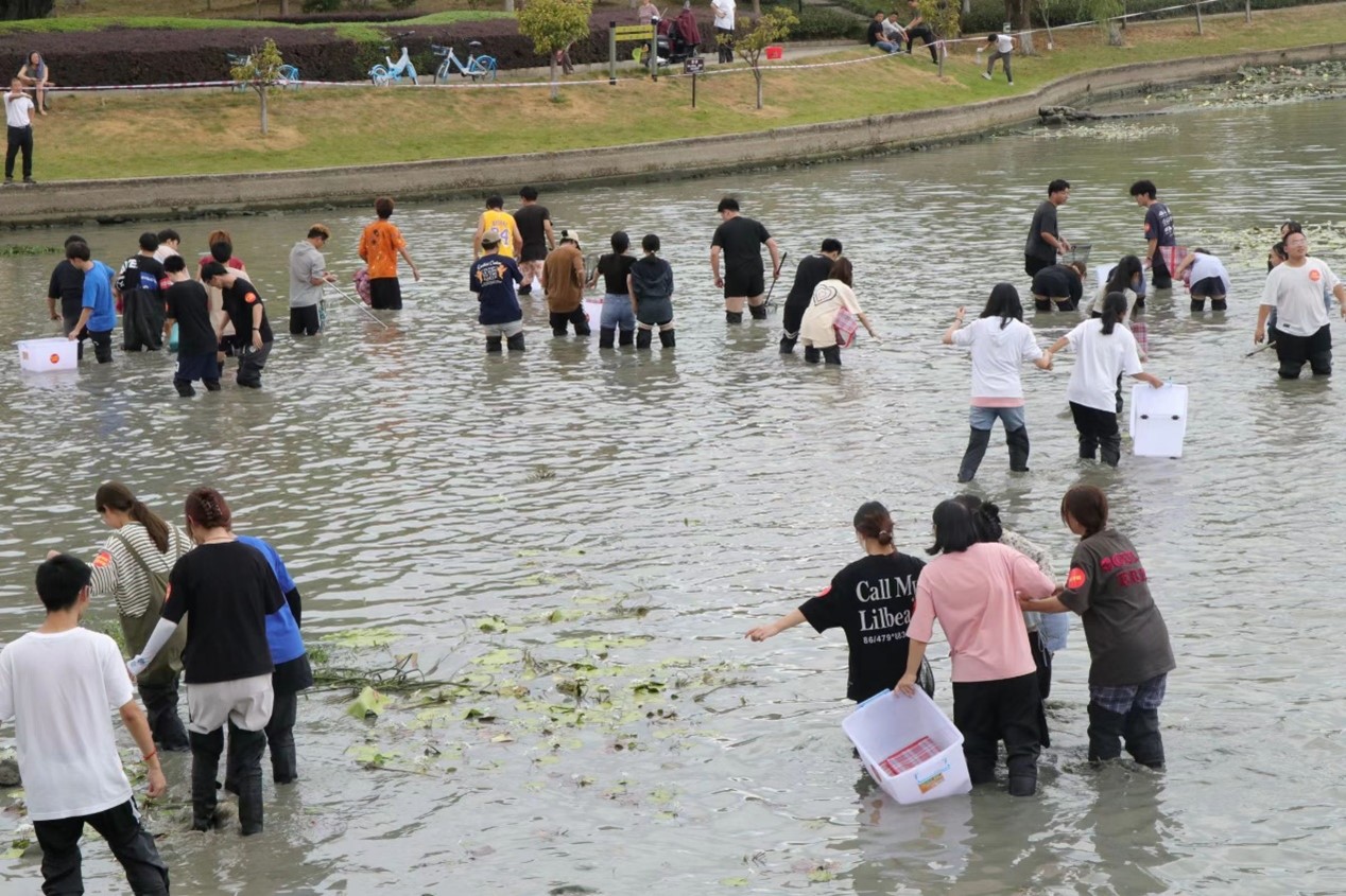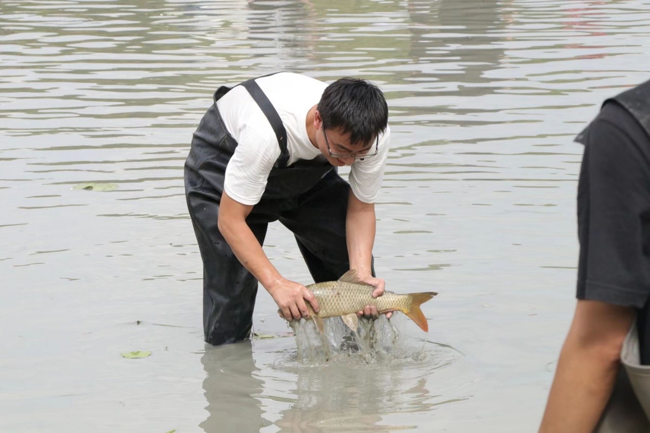 当天中午,大闸一开,明心湖水缓缓下降,岸边的同学早已穿戴完备,跃跃欲试。随着一声“开鱼咯”,湖面瞬间热闹了起来,草鱼、罗非鱼等纷纷被同学们抓入篓中,岸边的师生也举起手机,记录下难得的一幕。