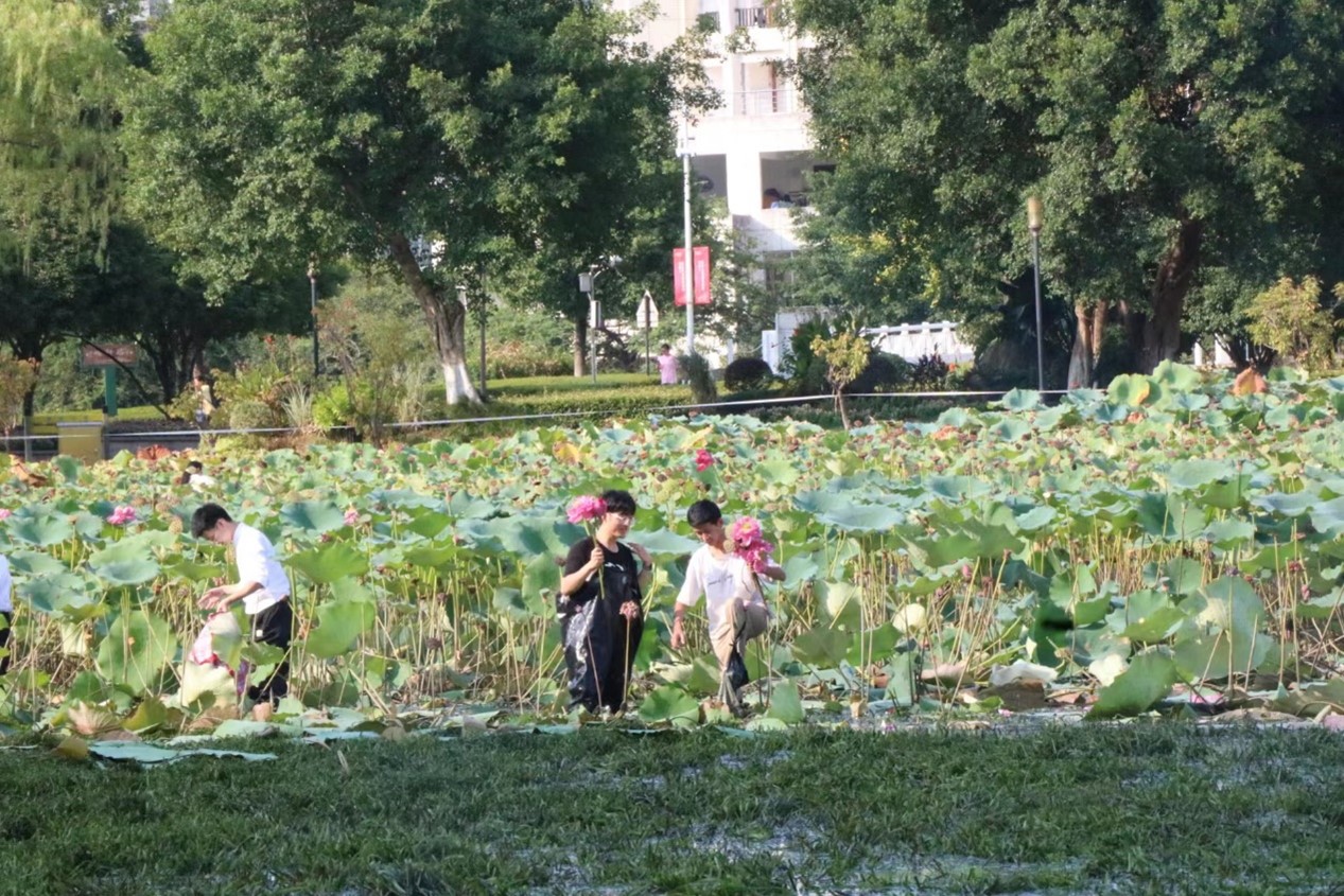 随着水面越来越低,湖底的水草逐渐露出,第二批第三批同学拿着割草刀和采藕工具依次下水,热火朝天地忙碌,为清洁明心湖贡献着自己的力量。“这样的劳动教育太好了,不仅学到了专业知识,也非常有趣!我是来自北方的同学,今天也体验了一把江南水乡的劳动,很有意义!”环境工程专业的一名同学开心地说道。