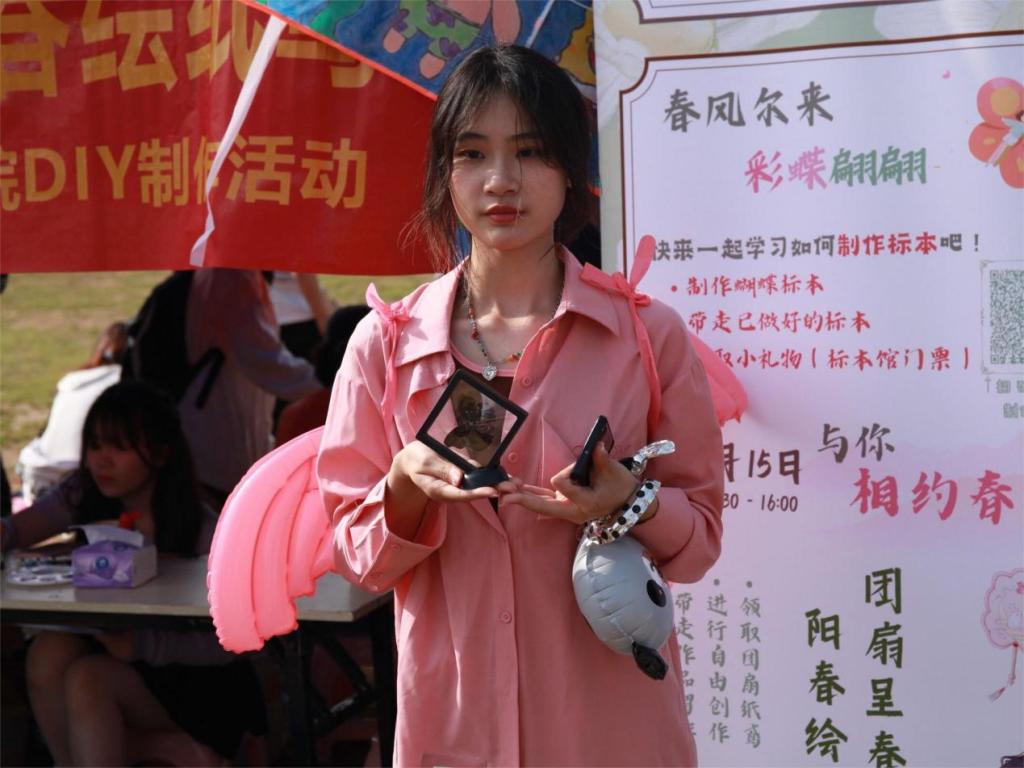在社团文化节中,公司开展了蝴蝶标本制作、团扇和纸鸢绘制活动,同学们全神贯注,指尖跳跃着绘出春天的图景。在蝴蝶标本制作处,大家根据教程制作蝴蝶标本,自己动手,感受将一只蝴蝶封存的过程,将蝴蝶的美丽定格在了标本里。在团扇与纸鸢绘制处,同学们选择自己喜欢的图案与文字,在团扇上尽情涂抹,释放想象力,品味春天的清新和悠闲,与好朋友一起对纸鸢进行上色,一起放飞自己亲手制作的纸鸢,领略春天的美丽,体悟传统文化的魅力。活动现场不断传来欢声笑语,来自各个公司和班级的同学们,都共同聚集在活动现场,相互交流彼此的经验和成果。他们将自己的作品在阳光下摆放、欣赏,与自己的作品合影留念,在这些手工制品的创造中品味着生活的美好。