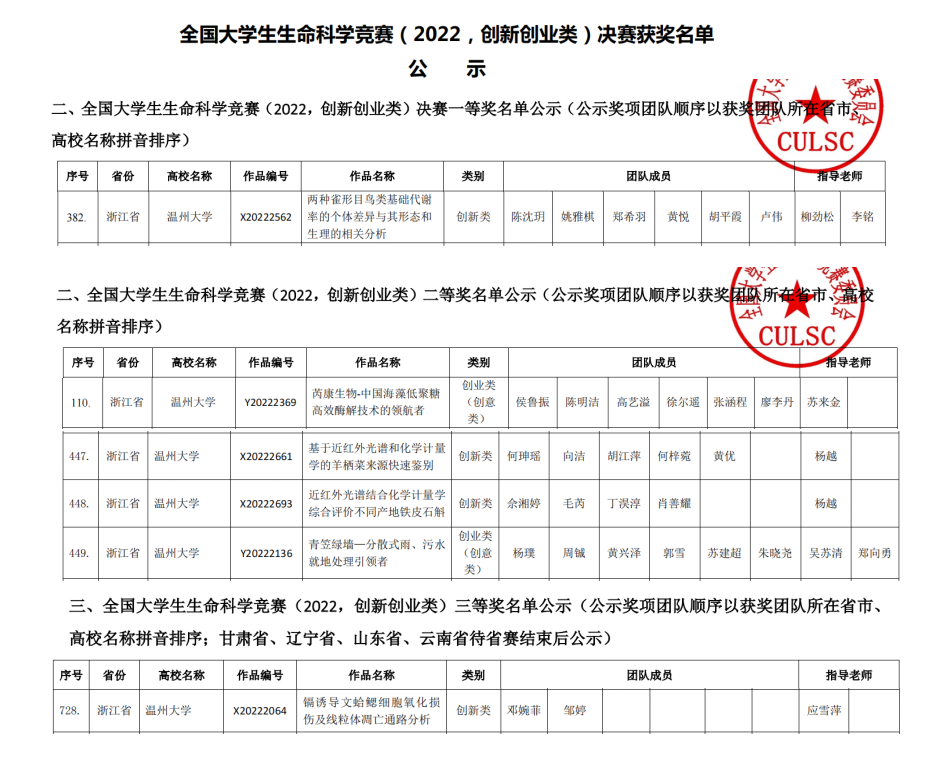 经过同学们的不懈努力指导老师的悉心教导,公司师生在此次比赛中喜获佳绩。其中柳劲松、李铭老师指导的员工团队荣获全国一等奖,苏来金老师指导的团队、杨越老师指导的两只队伍以及吴苏清、郑向勇老师指导的团队荣获全国二等奖,应雪萍老师指导的团队获得全国三等奖!在此次2022年全国老员工生命科学竞赛创新创业类大赛中,公司共获得1个全国一等奖、4个全国二等奖、1个全国三等奖。