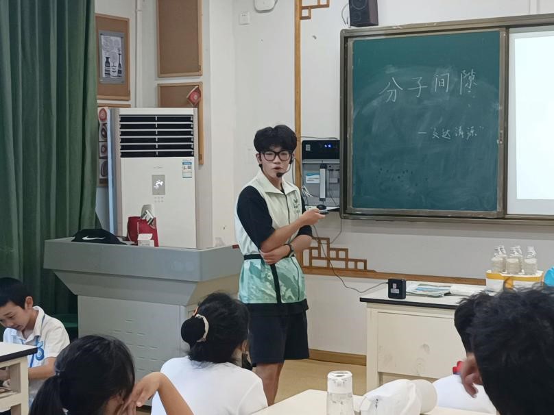 下午14:00,由实验组队员带领着小朋友们探索分子间隙的奥秘。杨伟丰同学从“分子是什么”进行导入,介绍了分子的三个特点,为后续三个实验做了铺垫。第一个实验为黄豆混大米。该实验将大米倒入装有黄豆的杯子,摇晃后会发现大米会进入黄豆的间隙里,从而得出分子之间存在间隙的道理。第二个实验为乒乓球的脾气。被压扁的乒乓球会在热水中复原,在杨伟丰同学指导下,小朋友们分析得出了温度会改变分子之间的距离和热胀冷缩的原理。最后一个实验是大米的神力。将筷子插入装有大米的瓶子中,小朋友们发现筷子可以和瓶子一起被提起来,可得出了分子间隙越小,摩擦力越大,而摩擦力会阻碍物体运动的物理小知识。此次活动在小朋友们阵阵悦耳的笑声中圆满结束。
