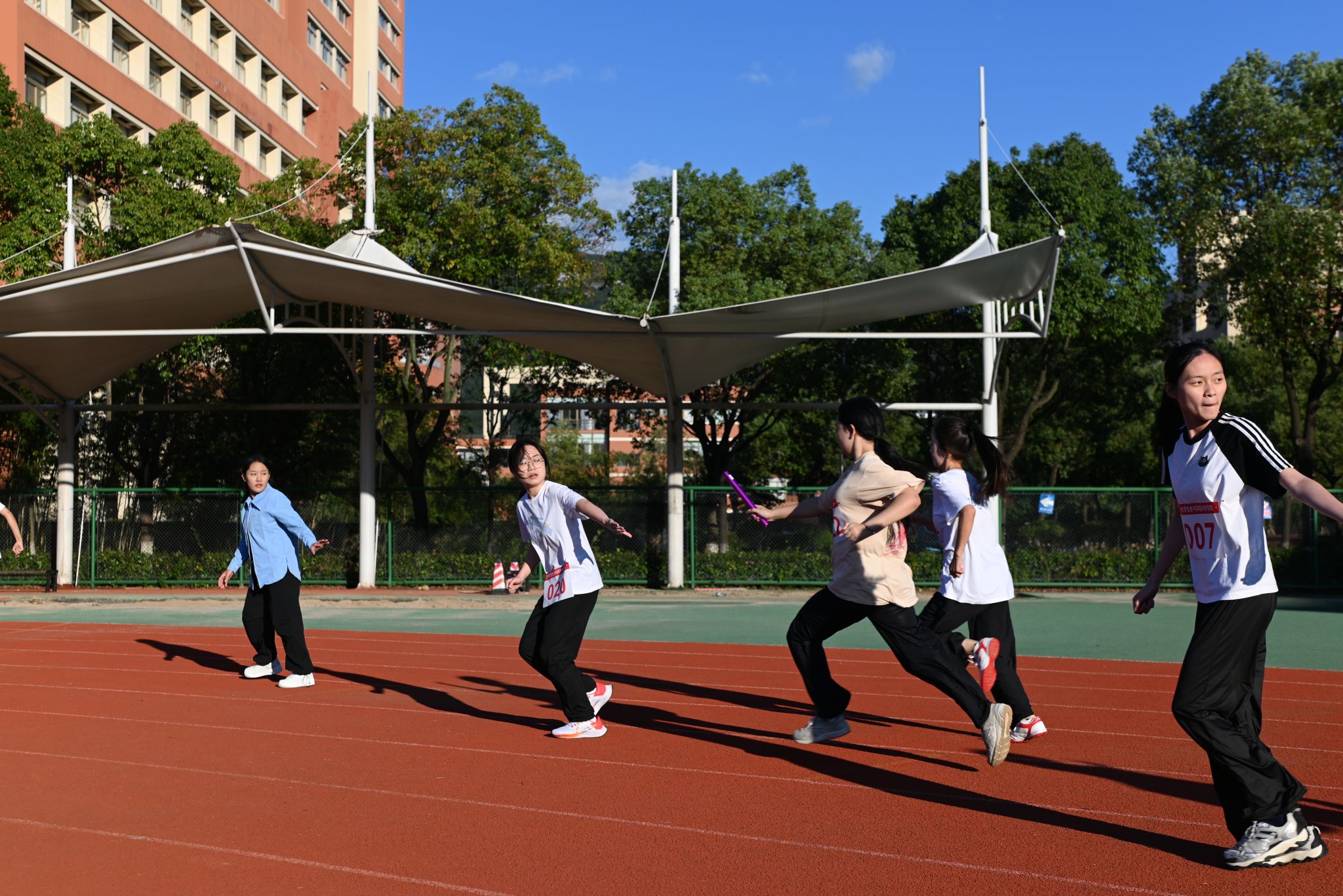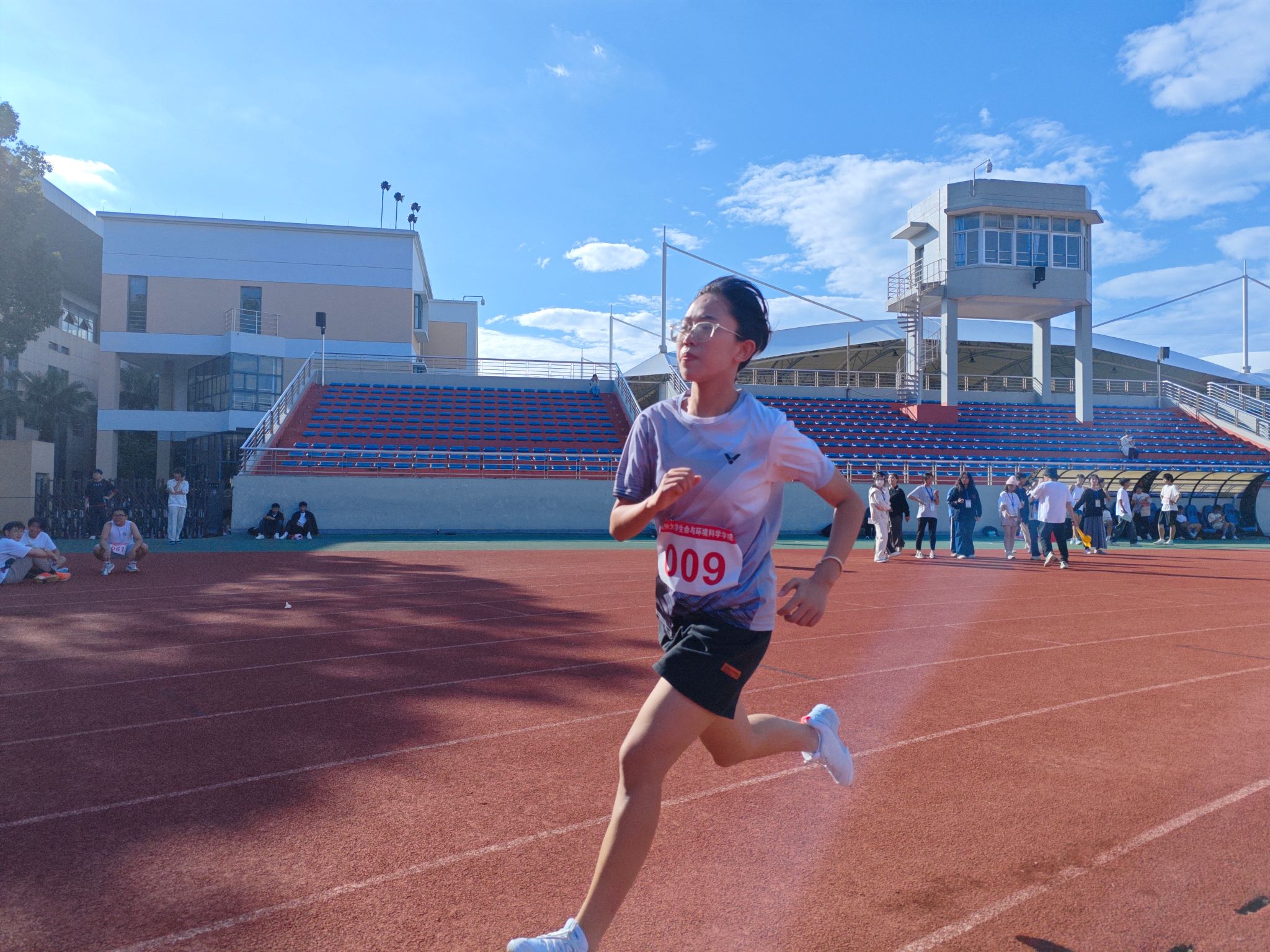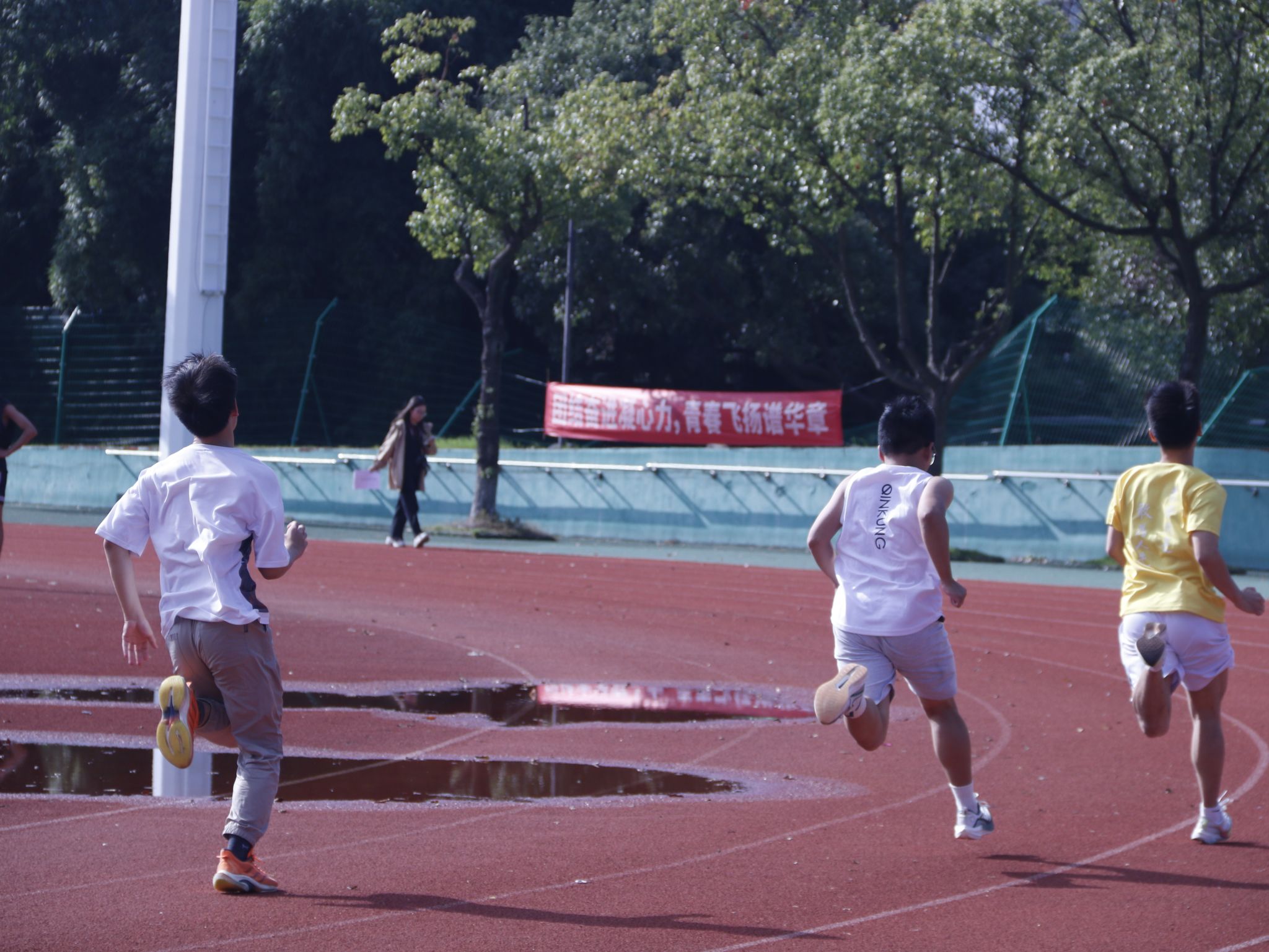 径赛场上,短跑运动员如闪电般飞驰在赤红的跑道上,他们的背后只留下了一阵清风。长跑运动员坚持不懈地奔跑在赛场上,滴滴汗水是他们对拼搏和永不言弃的体育精神的最好诠释。跨栏运动员一次次奔跃过栏杆都是对技巧与力量的考验,跌倒不是终点,冲线才是。紧接而来的是团体接力赛,运动员依次站在自己的起点上,虽然有的同学才刚刚完成个人项目,略显疲倦,但他们依旧拼尽全力,对为班夺冠的激情丝毫不减。接力棒于手中一次又一次地传递,他们的激情与信念也一次次地传递了下去。