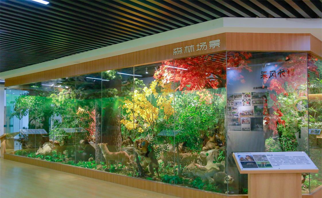 记者现场了解到,动物标本展示馆分为海洋场景展区、湿地展区、森林展区和系统分类展区,现有浸制、剥制、干制等标本1000余种,包含了从低等的刺胞动物到高等的哺乳动物。值得一提的是,来自浙江乌岩岭国家自然保护区、国家一级重点保护野生动物——黄腹角雉也陈列其中,与一只挺直身板站立的大黑熊并称为“镇馆之宝”。此外还有穿山甲、棱皮龟、卷羽鹈鹕等22种国家一级保护动物。动物们姿态各异,数十只蝴蝶歇在枝头,河麂、猞猁立于林间,鲨鱼在模拟海洋环境中“游弋”……